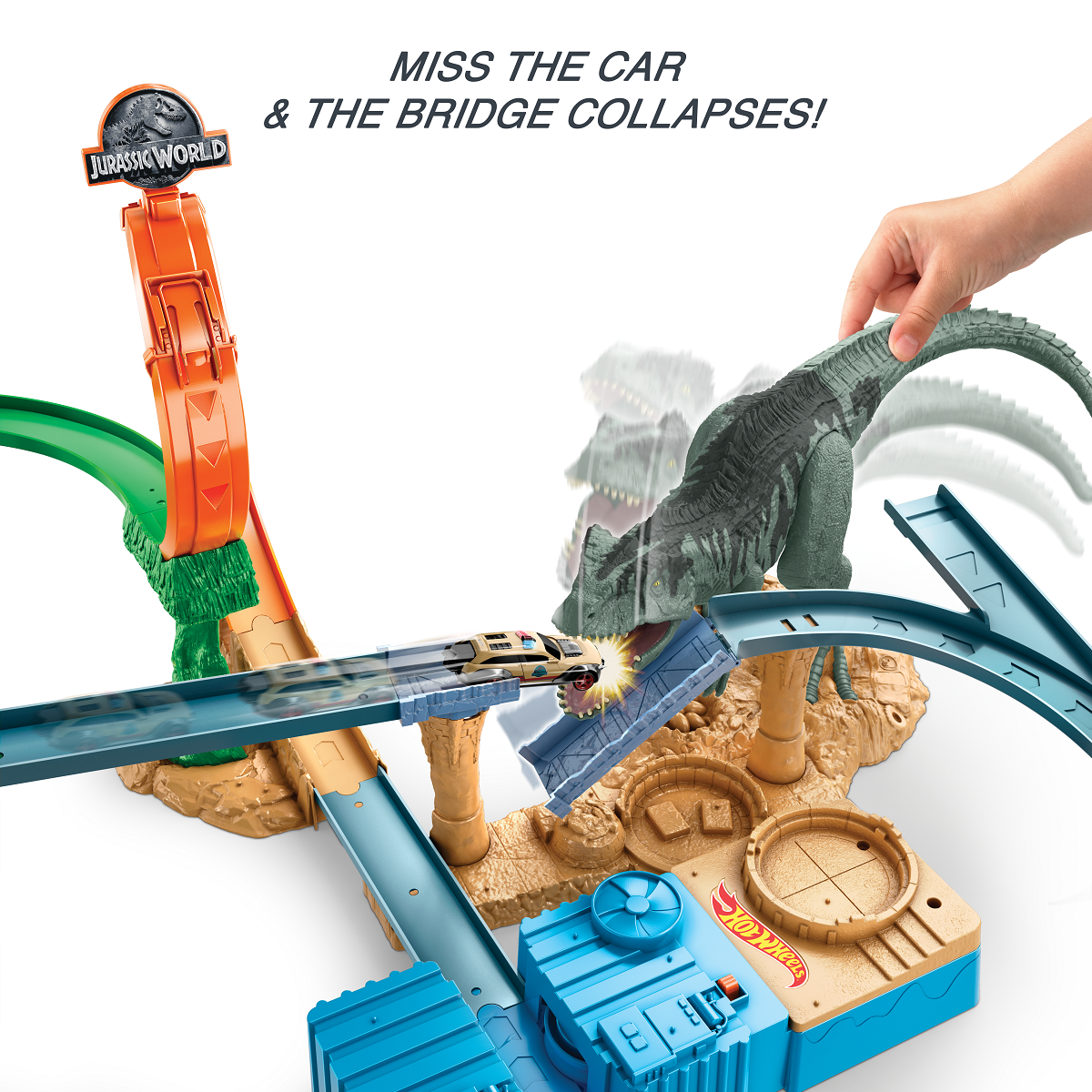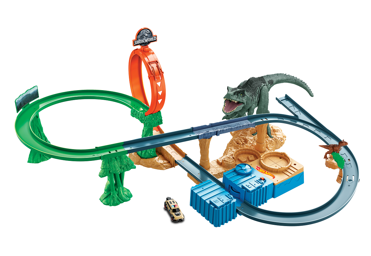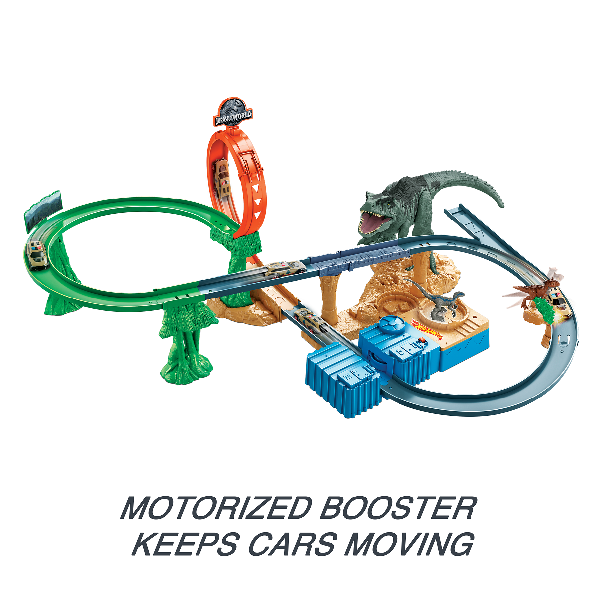 The set comes with a motorized booster that propels vehicles along the track while kids maneuver the massive Giganotosaurus to catch the car before it zooms past.