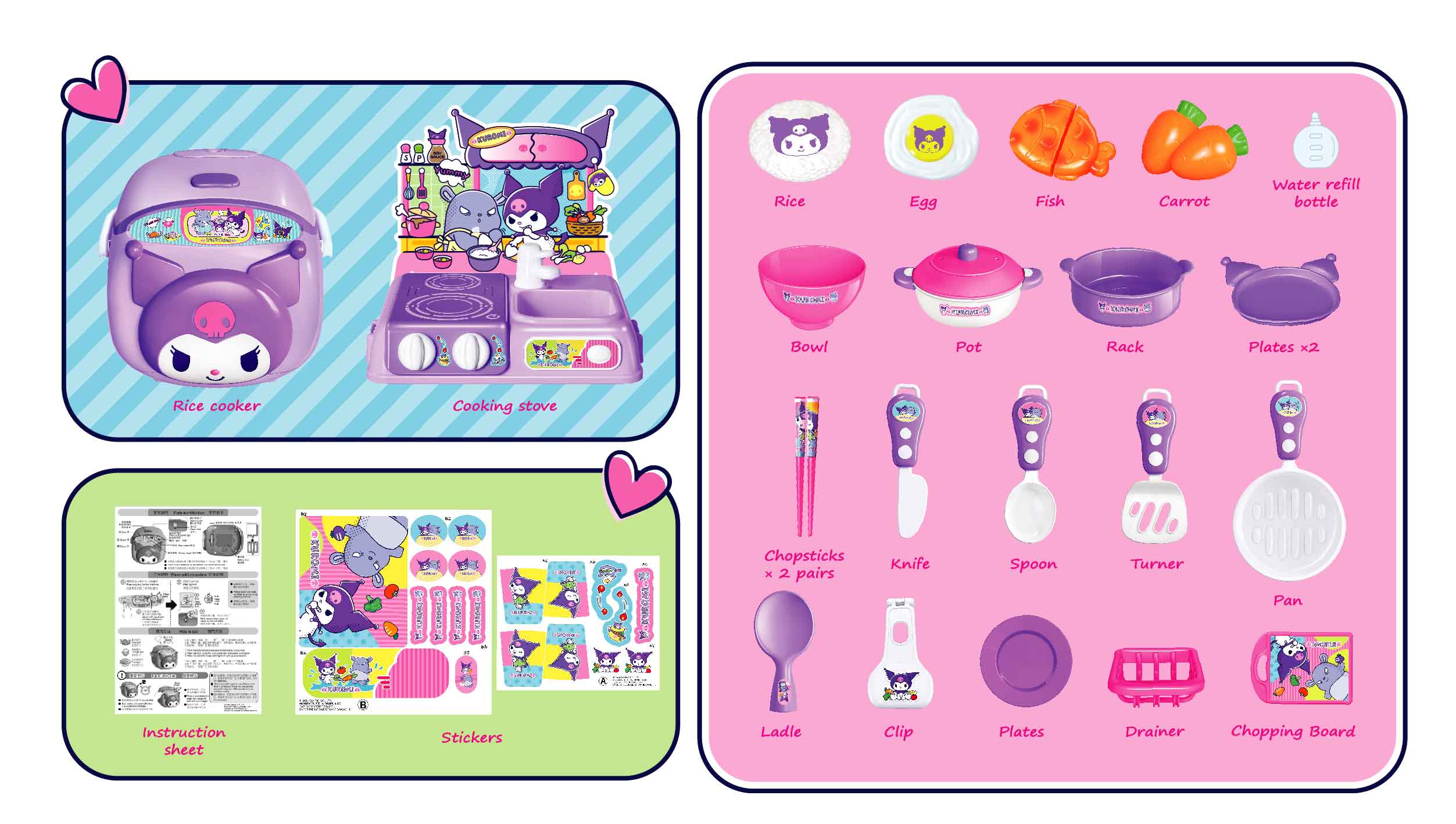 * ในชุดมาพร้อมกับหมอหุงข้าว เตาทำอาหาร อ่างน้ำ อุปกรณ์เครื่องครัวและของเล่นอื่นๆ