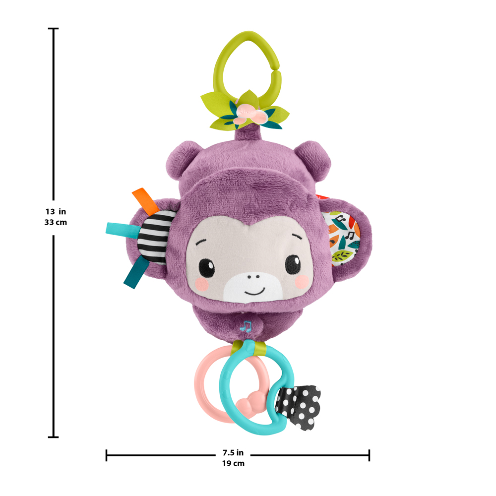 • Easily attach the monkey to your stroller canopy, baby gym or diaper bag for travel play.