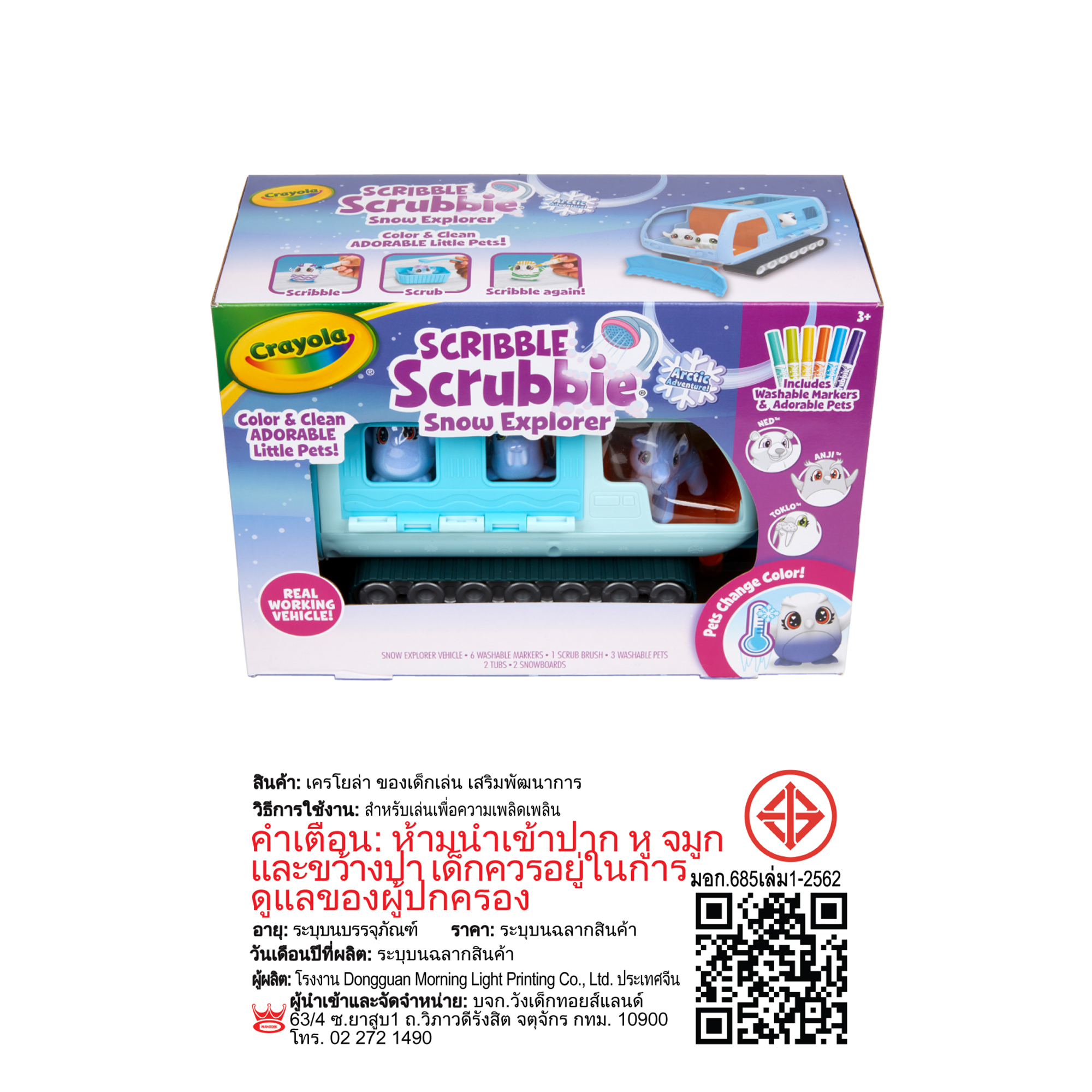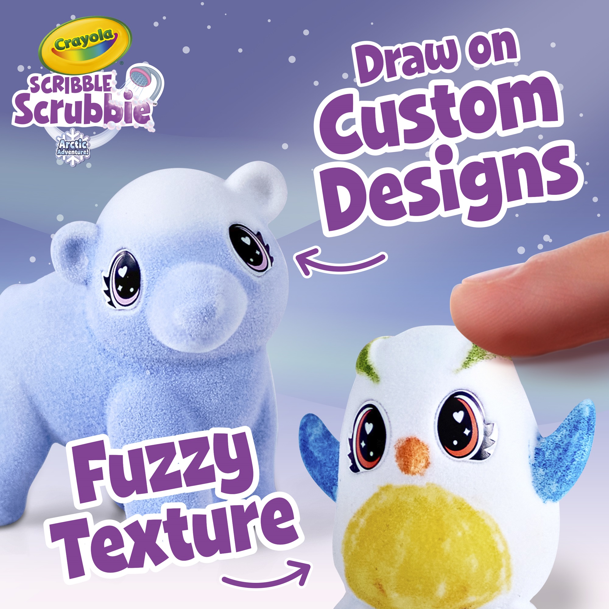 Embark on a creative adventure in the snowy lands with Scribble Scrubbie Arctic Pets! This set comes with 3 color-changing pets, 6 washable markers, 2 snowboards, 2 bathtubs, 1 scrub brush, and a snow explorer vehicle that also stores accessories. The animals change color with temperature—turning blue when cold and back to white when warm. Perfect for children aged 3 and up, offering endless fun with drawing, washing, and replaying.