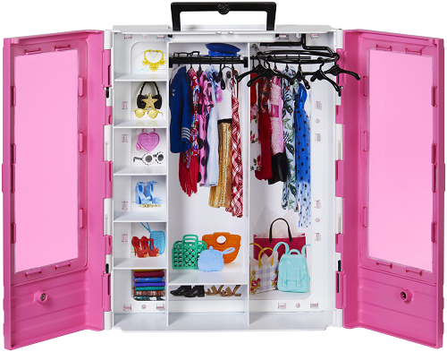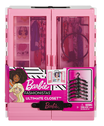 Pack Barbie® doll for a world of possibility! The Barbie® Ultimate Closet™ is designed for portability with a carrying handle. Decorated with Barbie® signature style, the pink closet features translucent doors for a peek into the wardrobe. Six included hangars help keep fashions fashionable, and lots of shelf space is perfect for the amazing accessories. A fold-out rack helps role-play dress-up fun. The easy carrying handle keeps the portable closet ready to travel, anywhere, for any occasion, because when a girl plays with Barbie®, she imagines everything she can become! Includes portable closet and six hangers; doll not included. Colors and decorations may vary.