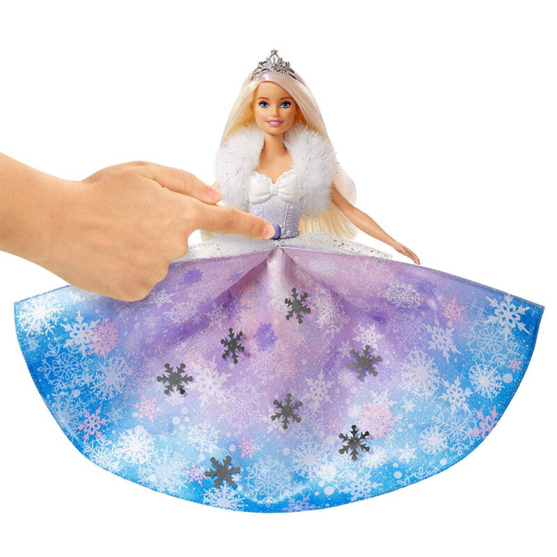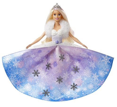 สนุกกับตุ๊กตาบาร์บี้แห่งโลกจินตนาการ เมื่อตุ๊กตาบาร์บี้เป็นเจ้าหญิงที่มาในชุดสีขาวม่วงและฟ้าเป็นประกายราวกับหิมะ และเมื่อกดปุ่มที่ท้องของตุ๊กตา กระโปรงก็จะกางออกให้เห็นลายชุดอย่างสวยงาม