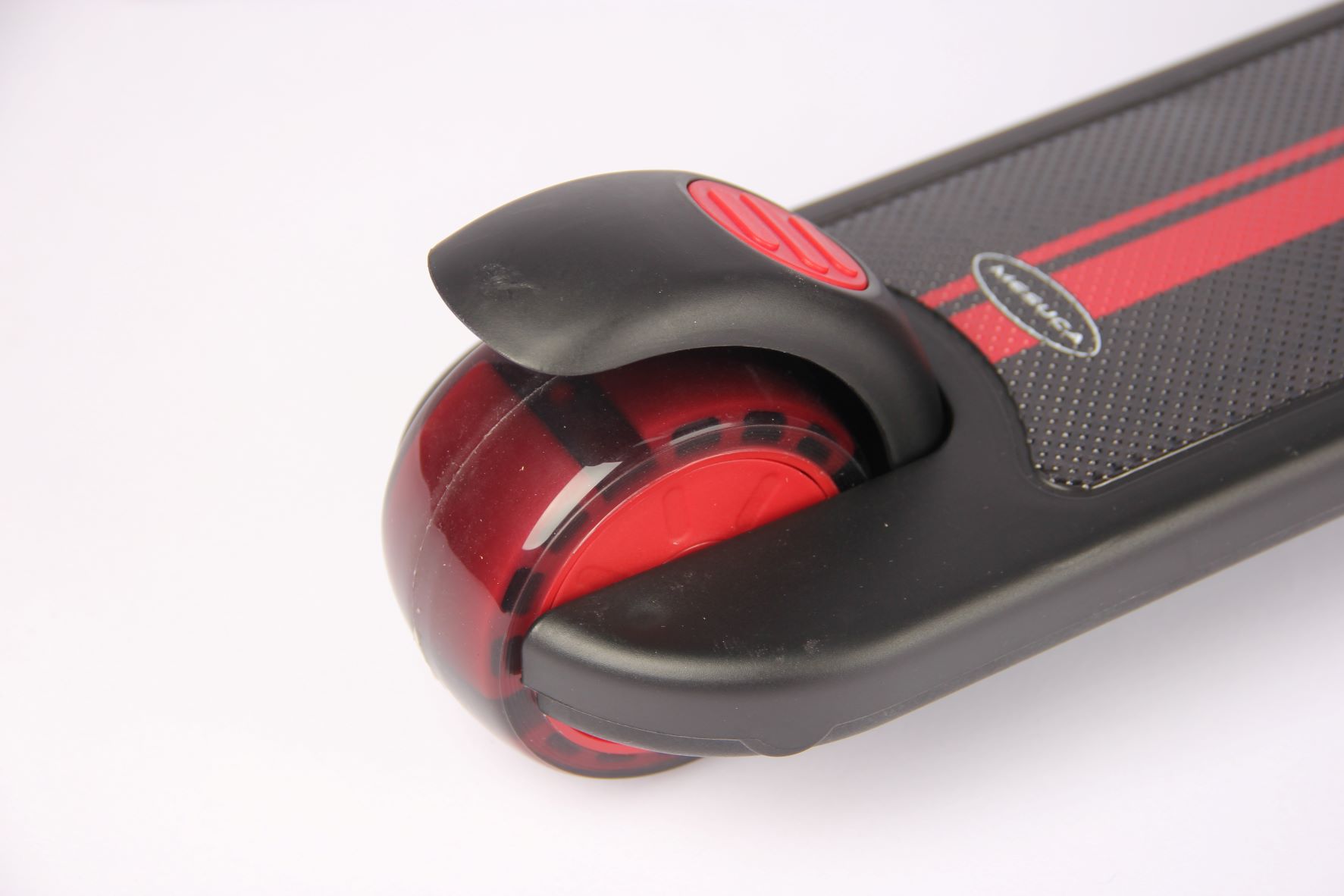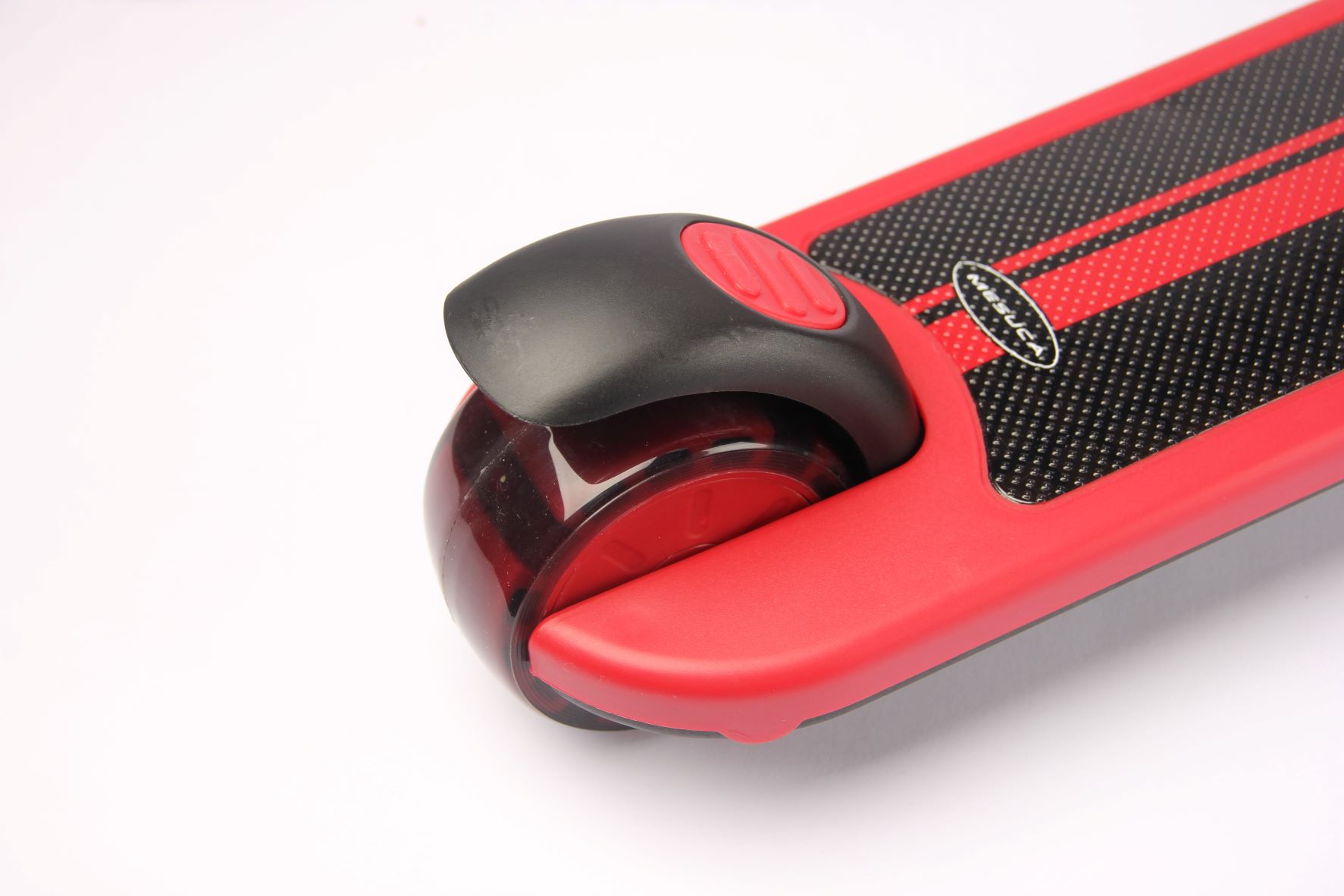 * Material: High strength aluminum frame /TPR hand grip /Abrasion resistant PP footboard /Wheels: high rebound PU wheel with LED light /Front wheels: 135x50mm. /Rear wheels: 80x24mm. /Bearings:ABEC-7 /Easy SAY FOLDING SYSTEM