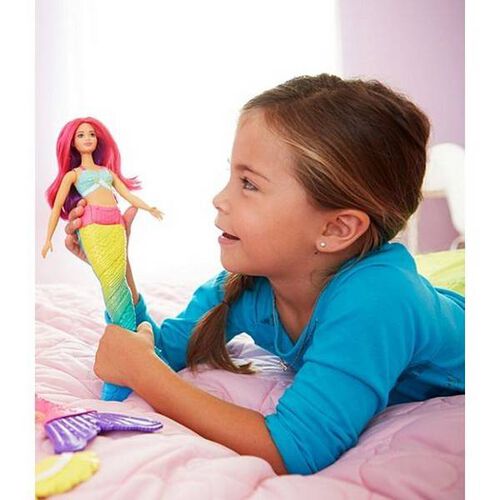 ตุ๊กตานางเงือกตุ๊กตาบาร์บี้มีหางที่สวยงามพร้อมการตกแต่งที่มีสีสันและสำเนียงที่ยอดเยี่ยม ตุ๊กตาไม่สามารถยืนหรือว่ายน้ำคนเดียวได้ สีและการตกแต่งอาจแตกต่างกันไป