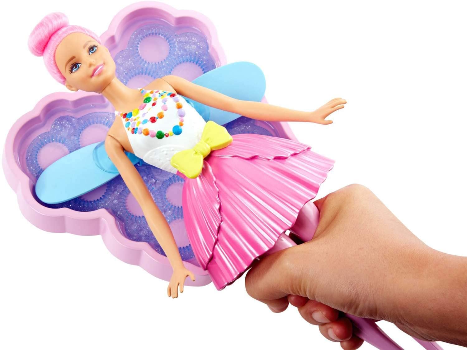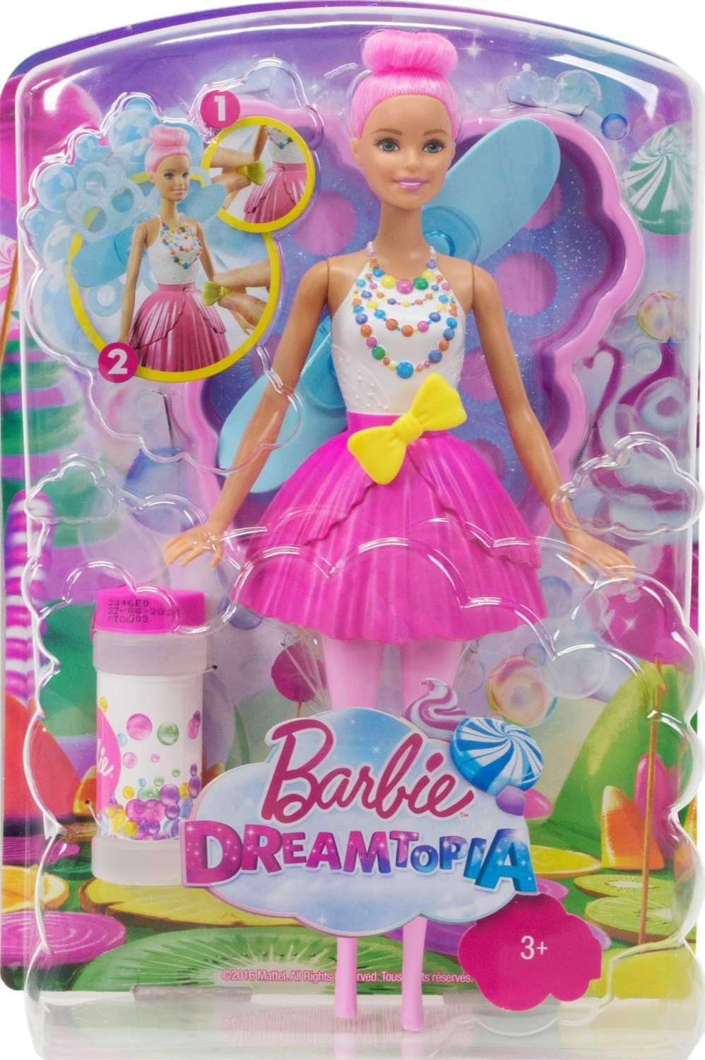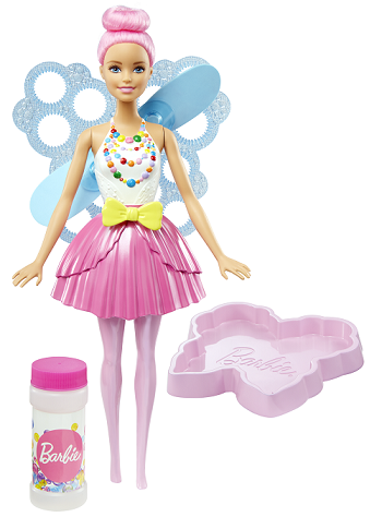 This fairy doll from Barbie™ Dreamtopia's Sweetville Kingdom is even sweeter with bubble-making wings! The fun feature is easy-to-use over and over because when you enter Dreamtopia with sisters Barbie® and Chelsea™, you wake up to a world where dreams become reality. Simply pour bubble solution (a bottle is included) into the butterfly-shaped tray, and dip Barbie® doll's wings into the solution -- her pretty blue wings are butterfly-shaped too. Then pull the yellow bow on her belt, and watch as the fan connected to the wings spins -- now you're making giant bubbles as you ""fly"" off to the next adventure! The Bubbletastic Fairy™ doll brings Dreamtopia to life wearing a bright dress with colorful candy shapes on her bodice and a pink fairy skirt that matches her vibrantly colored hair. Young dreamers will love adding bubbles to their stories and their play. Collect all of the Barbie™ Dreamtopia dolls and accessories and let your dreams take flight (each sold separately, subject to availability). Includes doll with bubble-making wings, bubble solution and solution tray. Doll cannot stand alone. Colors and decorations may vary.