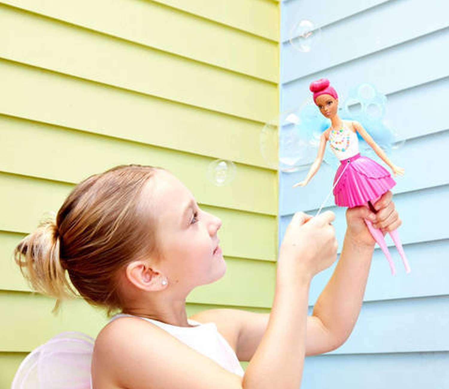 It’s so easy to make bubbles -- dip the wings into bubble solution and pull the yellow bow on Barbie® doll’s belt to spin the fan attached to her wings and make extra-big bubbles!