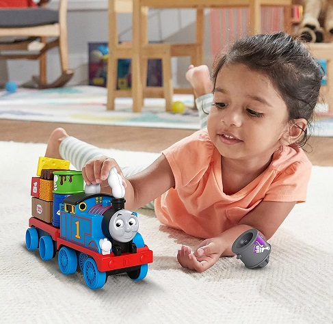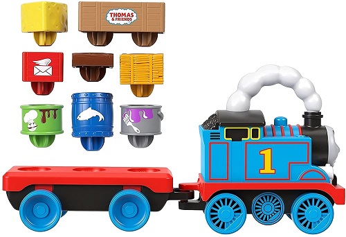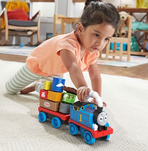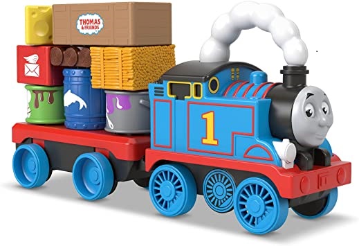 เด็กวัยหัดเดินสามารถฝึกวางสินค้าและการเคลื่อนที่กับเพื่อนแสนดีอย่างโทมัสได้แล้ว หัวรถไฟโทมัสแบบเข็นมือขนาดใหญ่นี้มาพร้อมกับชิ้นส่วนสินค้า 8 ชิ้น เจ้าตัวเล็กจะได้หัดวางซ้อนสินค้าอย่างไรก็ได้ตามต้องการ เมื่อโหลดสินค้าเสร็จแล้วมาลองเคลื่อนขบวนกัน สินค้าอาจจะโยกเยกไปมา แต่ระวังอย่าปล่อยให้ตกลงมาละ!