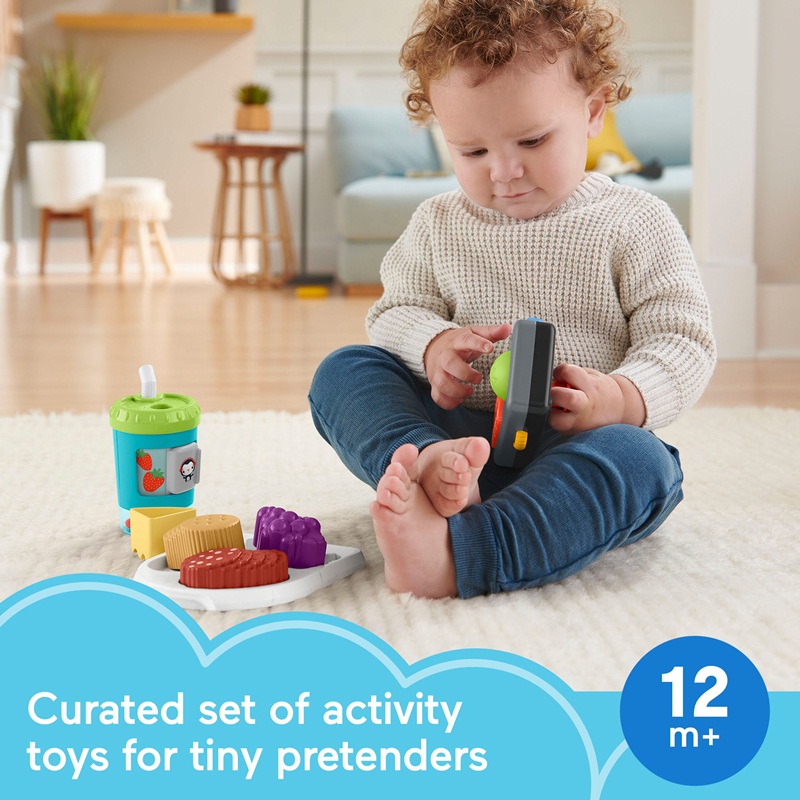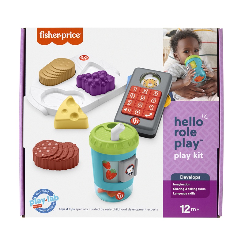 The Fisher-Price® Hello Role Play™ Play Kit is a specially curated gift set featuring three activity toys for little pretenders to explore, plus play tips from our child development experts at the Fisher-Price™ Play Lab. This pretend play set includes a toy phone with colorful lights and sounds, a smoothie cup activity toy to twist, rattle and slide, and a snack-themed puzzle with 4 shapes to sort. Designed for infants and toddlers ages 12 months and older, this play kit encourages super-fun imaginative play while exercising kids' fine-motor and problem-solving skills.