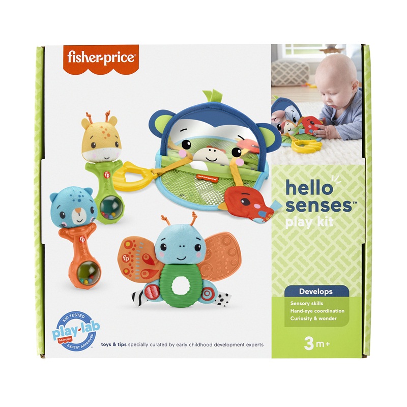 The Fisher-Price® Hello Senses™ Play Kit is a specially curated gift set featuring four sensory-stimulating activity toys for little explorers, plus play tips from our child development experts at the Fisher-Price™ Play Lab. This play set includes a take-along mirror toy, a crinkly butterfly teether, and a pair of colorful rattle pals. Designed for infants ages 3 months and older, this play kit is loaded with fun sights, sounds and textures to engage your baby's developing senses during tummy time and beyond.