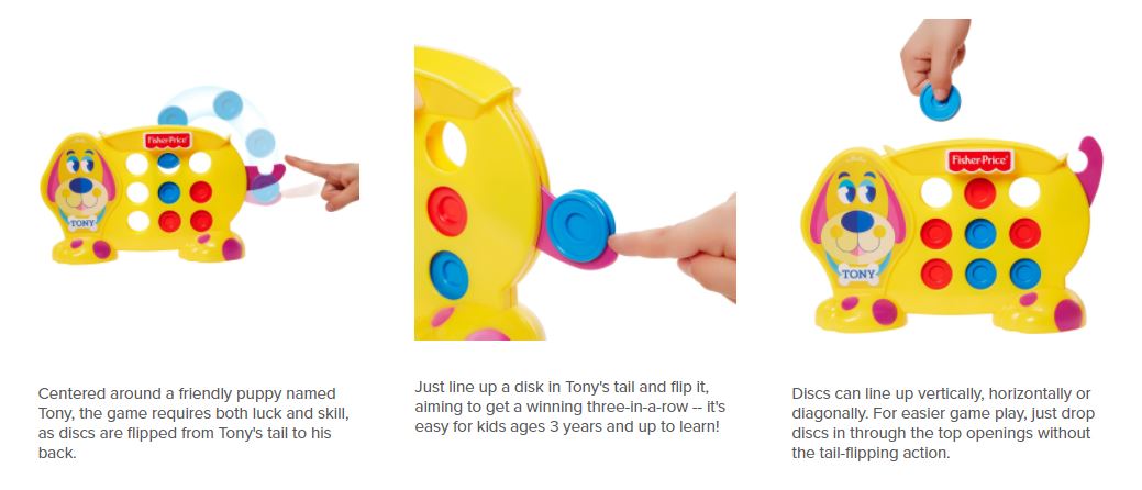 ลูกสุนัขน้อยน่ารักตัวนี้มีชื่อว่าโทนี่ วิธีเล่น ให้เด็ก ๆ แบ่งเป็น 2 ทีม เลือกเหรียญสีที่ต้องการเล่น และสลับกันโยนเหรียญลงในช้อง โดยต้องวางเหรียญบนหางของเจ้าโทนี่แล้วปล่อยให้หางดีดเหรียญลงในช่อง ฝ่ายที่เรียงเหรียญสีตัวเองเป็นเส้นตรง 3 เหรียญต่อกันเป็นเส้นตรงแนวนอน แนวตั้งหรือแนวทแยงมุมได้ก่อนเป็นผู้ชนะ เกมนี้มากับโชคและทักษะการกำหนดตำแหน่งให้เหรียญลงช่องที่ต้องการกอายุ สามารถเล่นได้พร้อมกัน 2-4 คน