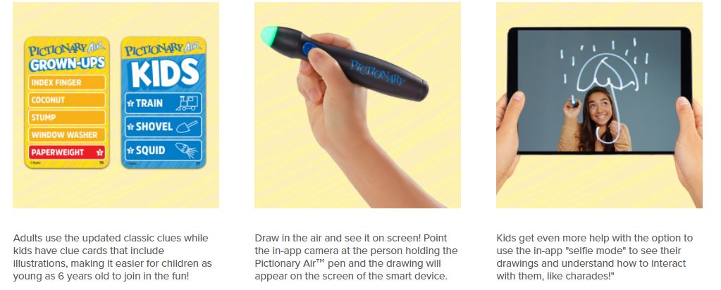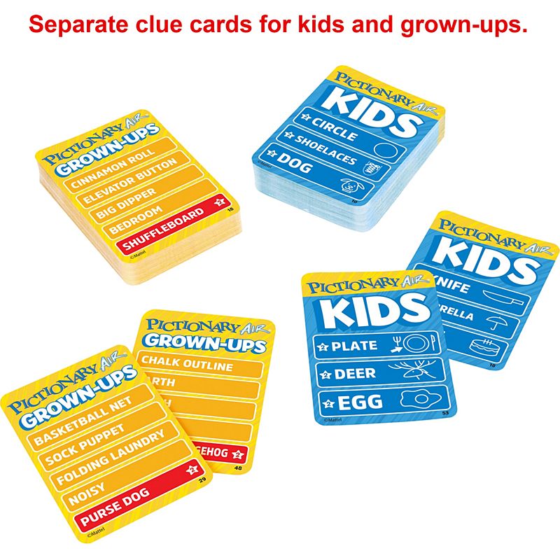 Pictionary Air เกมทายภาพวาดในอากาศที่เล่นได้ทั้งครอบครัว และในชุดนี้ไม่ว่าจะเด็กหรือผู้ใหญ่ก็เล่นด้วยกันได้ เพราะมีทั้งระดับง่ายและระดับยากในเกมเดียว การ์ดคำใบ้จึงมีสองด้านในหนึ่งใบ ด้านหนึ่งเป็นคำใบ้ปกติระดับผู้ใหญ่ แต่อีกด้านของการ์ดคำใบ้จะมีภาพประกอบทำให้ง่ายและสนุกต่อเด็กอายุ 6 ขวบขึ้นไปในการเล่น เมื่อเด็ก ๆ หยิบการ์ดแล้วให้เลือกคำใบ้บนการ์ด 1 คำ แล้วใช้ปากกาวาดภาพในอากาศวาดตามภาพประกอบในการ์ด หรือจะใช้เซลฟี่โหมดเป็นตัวช่วยก็ได้ เพื่อมองว่าภาพที่ตัวเองวาดในอากาศอยู่เป็นอย่างไร และเพื่อนในทีมจะต้องพยายามทายให้ถูก ก่อนเล่นอย่าลืมดาวน์โหลดแอปพลิเคชัน Pictionary Air ได้ฟรีลงในสมาร์ทโฟนหรือแท็บเล็ต (ใช้ได้ทั้งระบบ iOS และ Android) ให้ผู้ที่ทายเปิดกล้องในแอปพลิเคชัน Pictionary Air แล้วเล็งไปที่ผู้วาดภาพ ภาพวาดจากกลางอากาศจะปรากฏขึ้นบนหน้าจอของอุปกรณ์ของคุณ เมื่อเด็ก ๆ เล่นเกมสามารถเปิดเซลฟี่โหมดเพื่อช่วย หรือหากต้องการให้เห็นชัดเจนยิ่งขึ้น สามารถส่งภาพวาดจากอุปกรณ์ของคุณไปยังหน้าจอทีวีได้โดยใช้ Apple TV, Chromecast หรืออุปกรณ์สตรีมมิ่งที่เข้าระบบกันได้เพื่อสตรีมเกมไปยังจอทีวี สำหรับรายละเอียดเพิ่มเติมเกี่ยวกับอุปกรณ์ที่รองรับและข้อมูลอื่น ๆ โปรดตรวจสอบได้ที่ www.pictionary.com/support