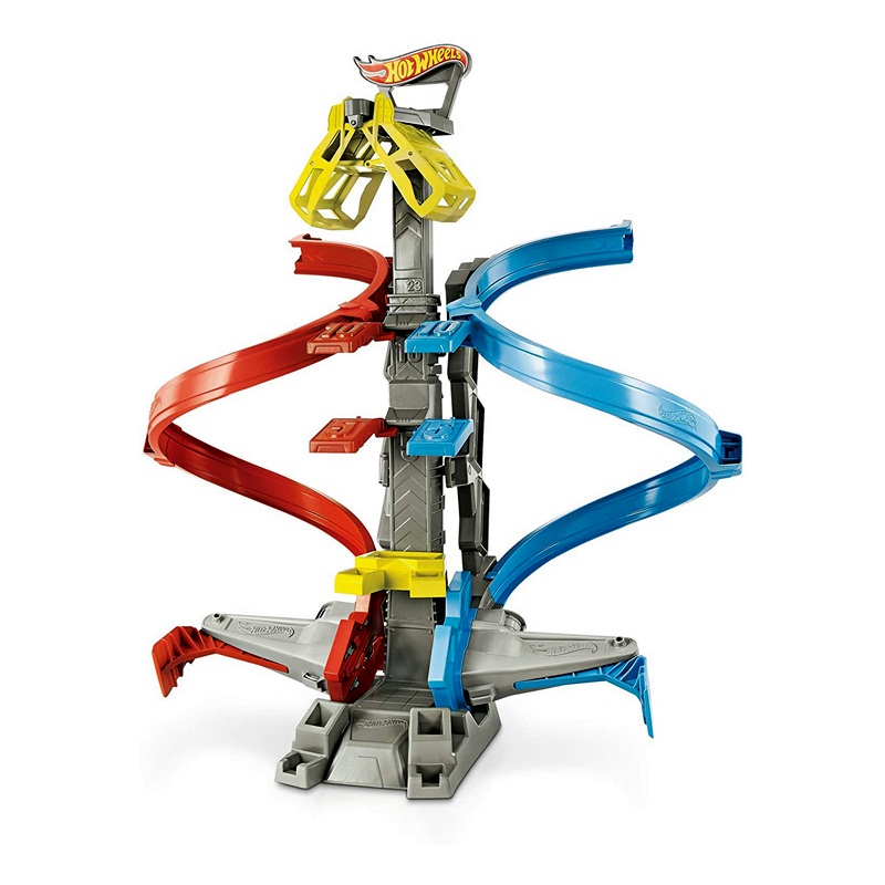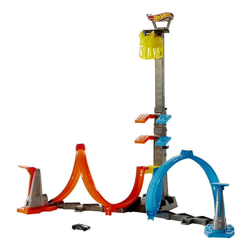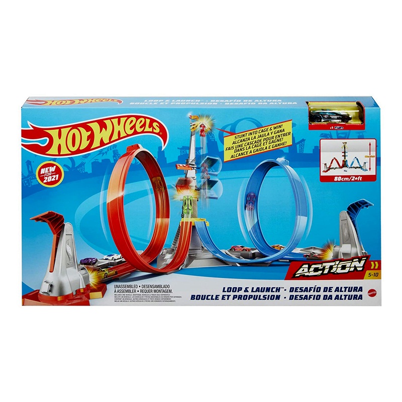 Hot Wheels Loop & Launch Track Set พุ่งทะยานสู่ความท้าทายใหม่ที่ความสูงถึงสองฟุต! เร่งความเร็วผ่านวงเกลียวแล้วทะยานขึ้นกลางอากาศเข้าสู่กรงซึ่งจะงับปิดเข้าหากันเมื่อรถขึ้นมาถึง กรงนี้สามารถปรับระดับยกขึ้นหรือลงได้ขึ้นตามต้องการ