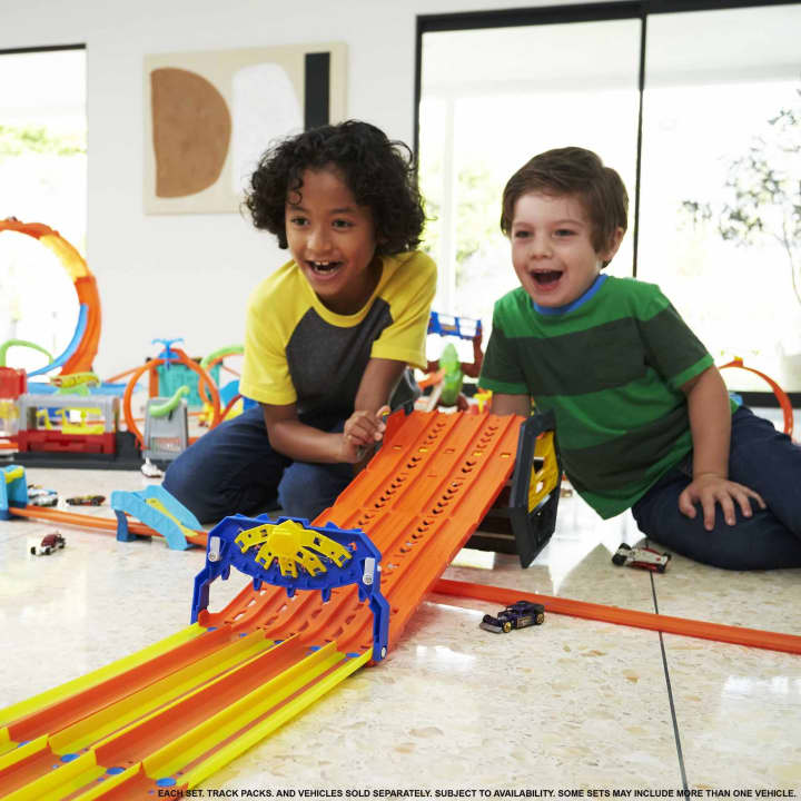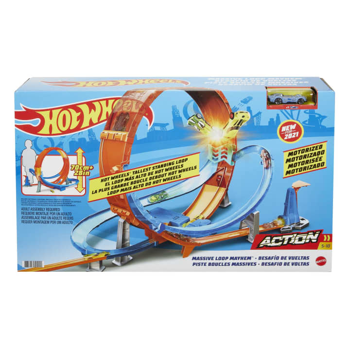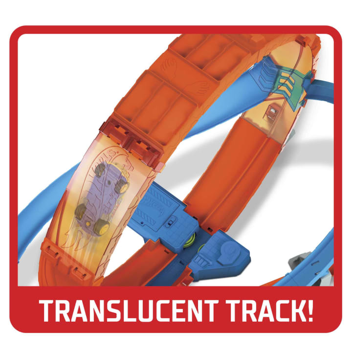 ท้าตลบตื่นเต้นเร้าใจไปกับชุดรางตีลังกาวงใหญ่จากฮอตวีล! รางตีลังกาแบบห่วงกว้าง 28 นิ้วขนาดใหญ่ที่ออกแบบมาสำหรับการเล่นรถหลายคันด้วยกัน! ใช้ที่ปล่อยรถส่งรถคันแรก จากนั้นปล่อยรถเข้าไปเพิ่มขึ้นเรื่อย ๆ แล้วมาดูกันว่าคันไหนจะชนกันบ้าง ความท้าทายอยู่ที่จำนวนรถที่สามารถวิ่งในลูปได้พร้อมกัน เคล็ดลับอยู่ที่จังหวะเวลาและทักษะ มาพร้อมรถฮอตวีลขนาด 1:64 หนึ่งคัน