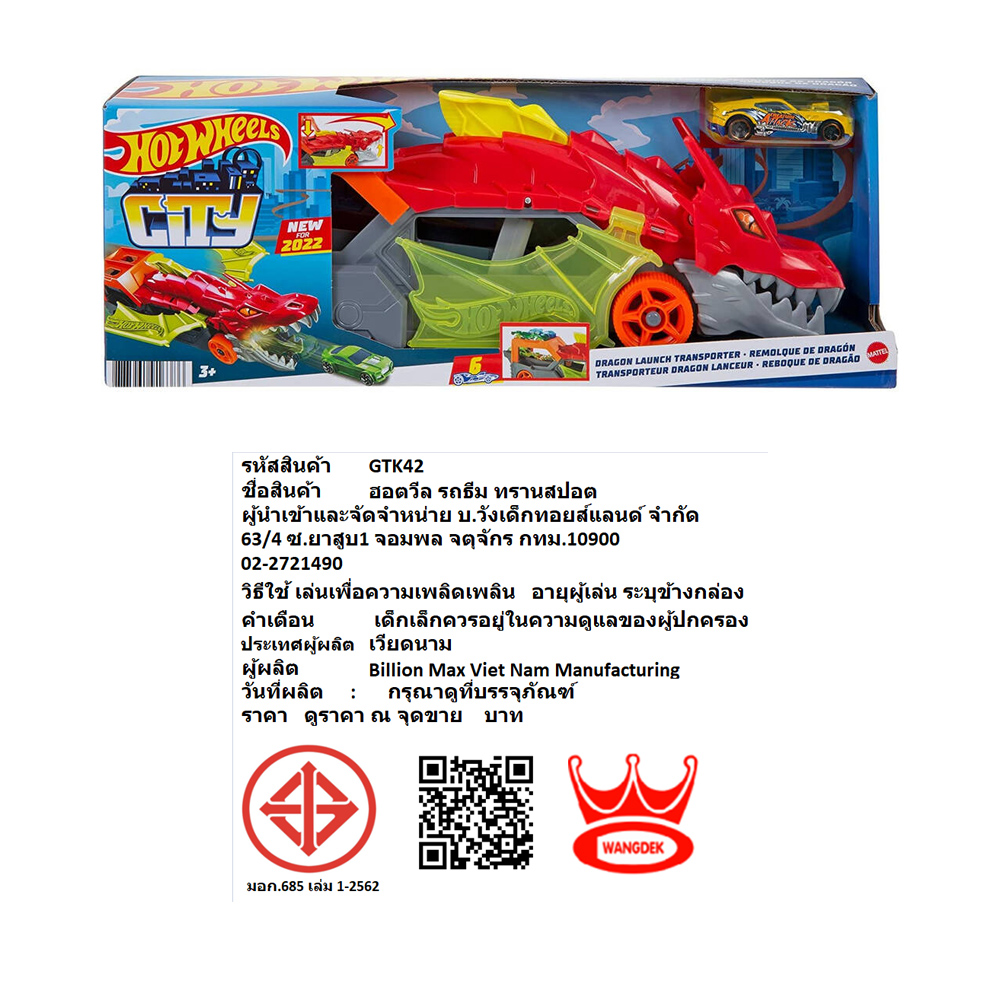 รถบรรทุกรถฮอตวีลสุดเจ๋งในแบบฉบับมังกรเจ้ามังกรตัวนี้ไม่ได้มาพ่นไฟ แต่มาเพื่อพ่นรถฮอตวีลออกจากปาก เพียงใส่รถฮอตวีลเข้าไป 3 คันแล้วกดที่ปล่อยรถเพื่อให้รถพุ่งออกไปสู่การผจญภัยอันน่าตื่นเต้น ที่ด้านหน้าและด้านหลังของเจ้ามังกรมีจุดสำหรับเชื่อมรางฮอตวีลอื่น ๆ มาพร้อมกับรถฮอตวีลขนาด 1:64 จำนวน 1 คัน