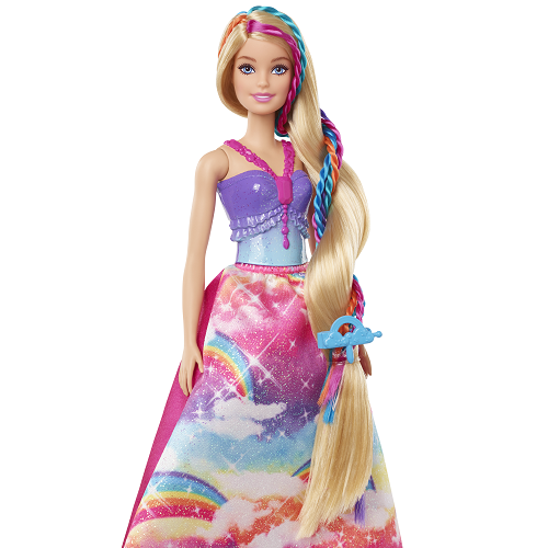 ตุ๊กตาเจ้าหญิงบาร์บี้ที่มีผมยาวเป็นพิเศษถึง 8.5นิ้ว ให้น้อง ๆ ได้สนุกไปกับเครื่องถักเปียอัตโนมัติ เพียงน้อง ๆ แบ่งผมบาร์บี้ให้เท่าๆกัน ใส่ไปในเครื่องแล้วกดปุ่ม บาร์บี้ก็จะมีผมเปียที่สวยงาม