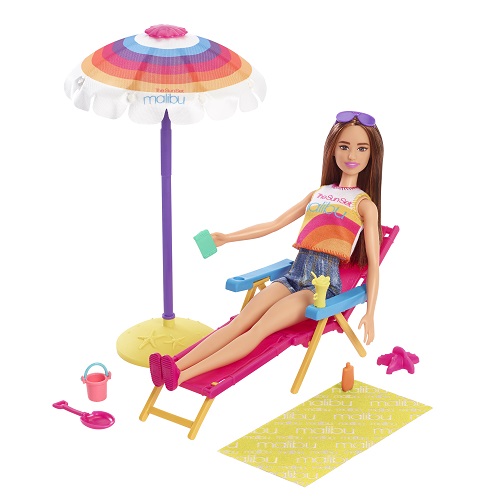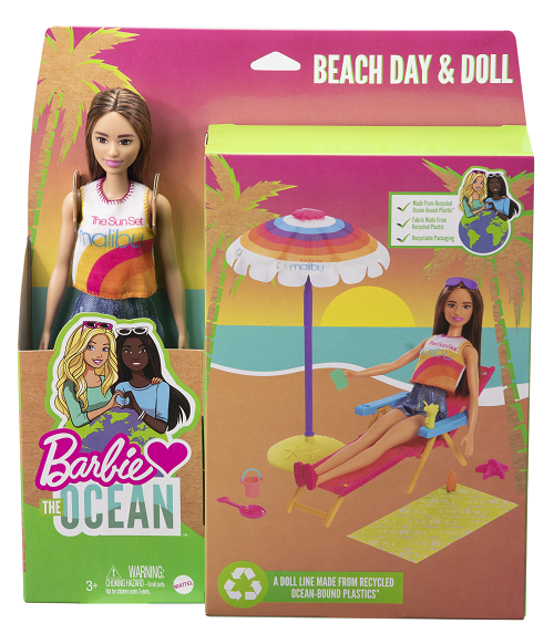 บาร์บี้รุ่นพิเศษ ผลิตจากพลาสติกรีไซเคิล มาพร้อมกับอุปกรณ์ครบครันสำหรับการไปเที่ยวชายหาด ไม่ว่าจะเป็นเก้าอี้ชายหาดสีชมพูสดใส ร่มคันใหญ่ เสื่อปู แว่นตา หรือแม้แต่ปลาดาว ให้น้อง ๆ หนู ๆ ได้ชิลล์กับตุ๊กตาบาร์บี้เวลาไปเที่ยวชายหาด หรือทุกเวลาที่ต้องการ