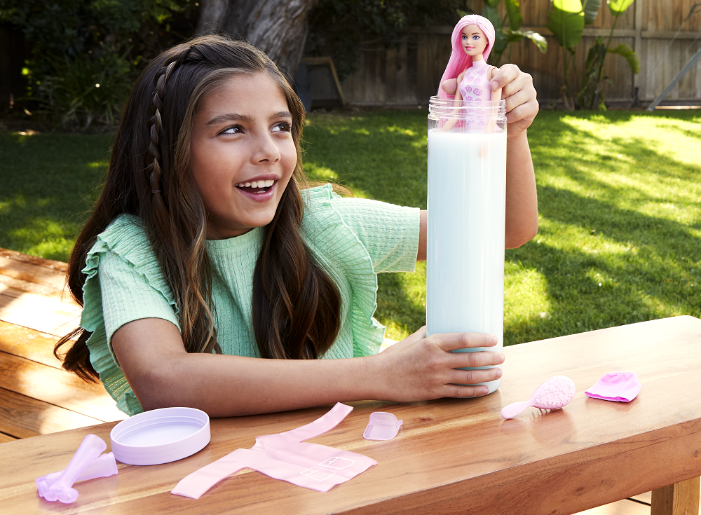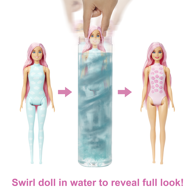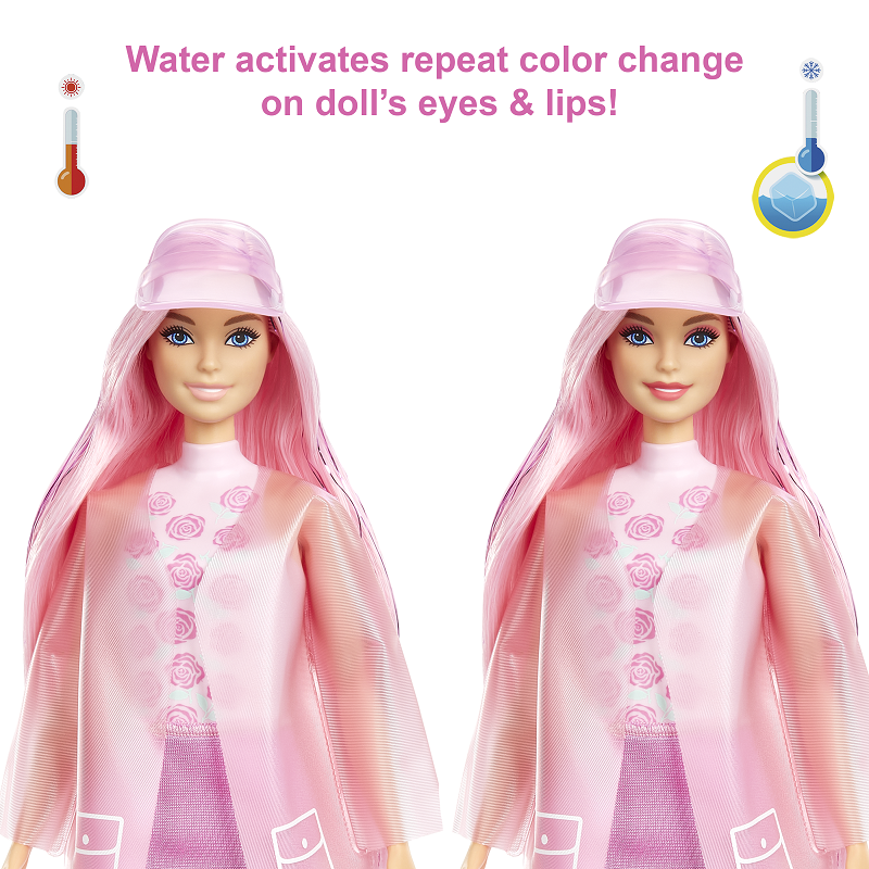 เพียงเปิดฝาแล้วเติมน้ำอุ่นลงไป ปิดฝาแล้วเขย่า ๆ น้ำในขวดจะเปลี่ยนเป็นสีท้องฟ้าสดใส และตุ๊กตาบาร์บี้ก็จะเผยโฉมออกมา จากนั้นเปิดซองสุ่มเพื่อพบกับความเซอร์ไพรส์อีกขั้น! ด้วยแอกเซสซอรี่และชุดที่เข้ากับหน้าฝน อย่าลืมลองใช้น้ำเย็นแตะที่ปากของตุ๊กตาแล้วรอพบกับการเปลี่ยนแปลงที่น่าทึ่งด้วยนะ เมื่อพร้อมแล้วก็ออกไปท้าฝนกันเลย!