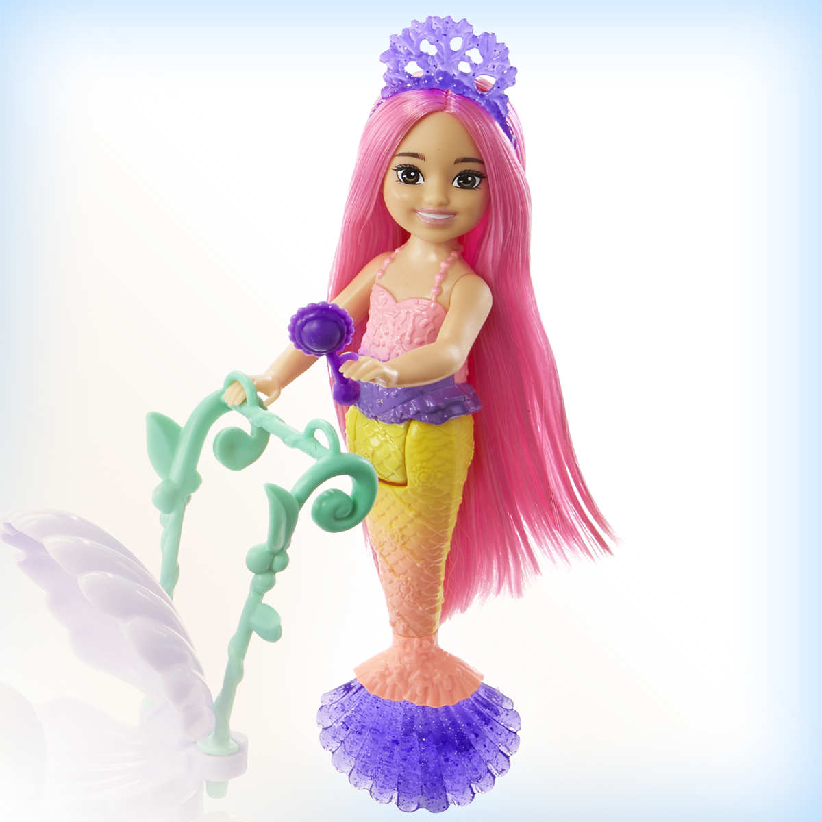 * ตุ๊กตาเชลซีสวมชุดนางเงือกสีสดใส สีผมสีชมพูพร้อมมงกุฏนางเงือก