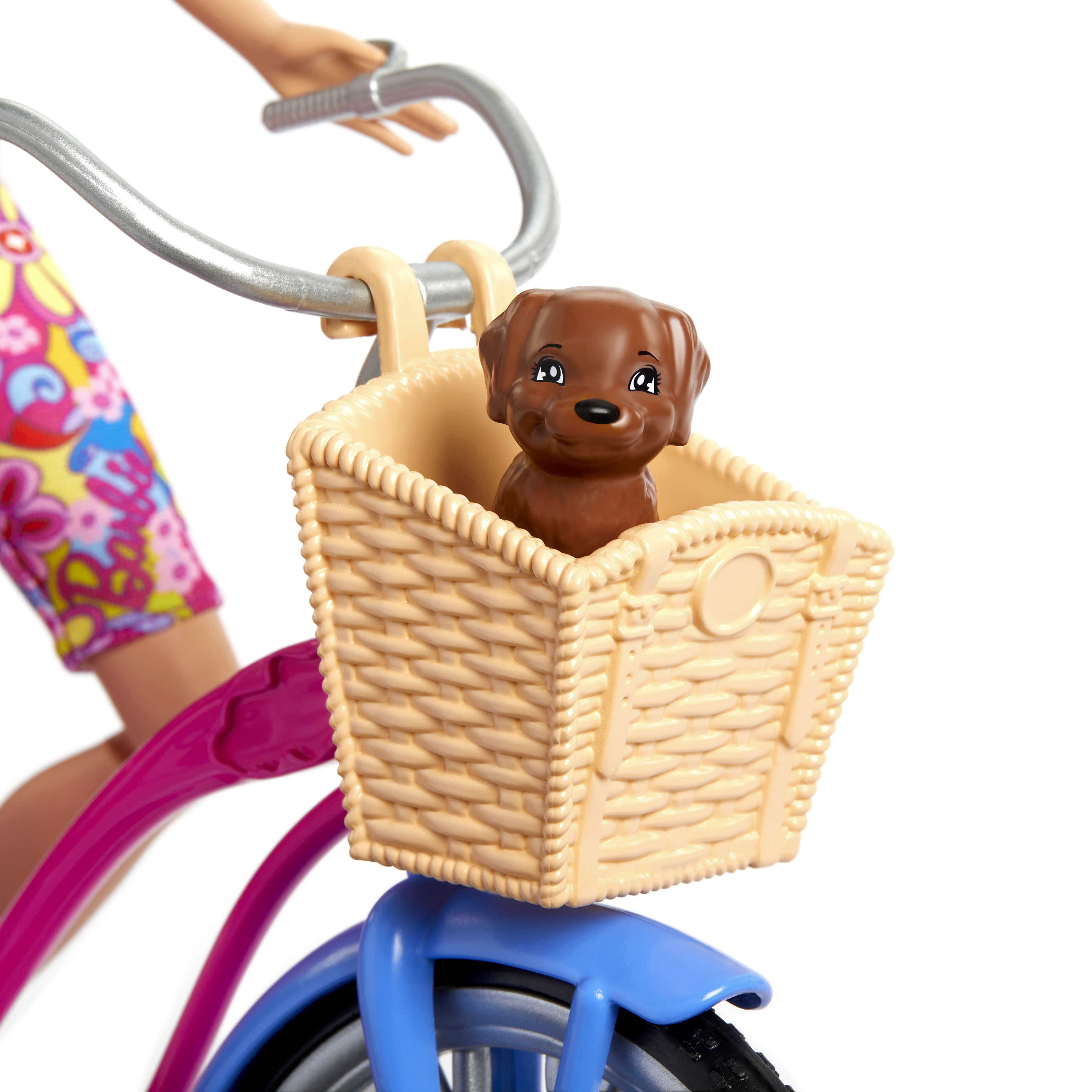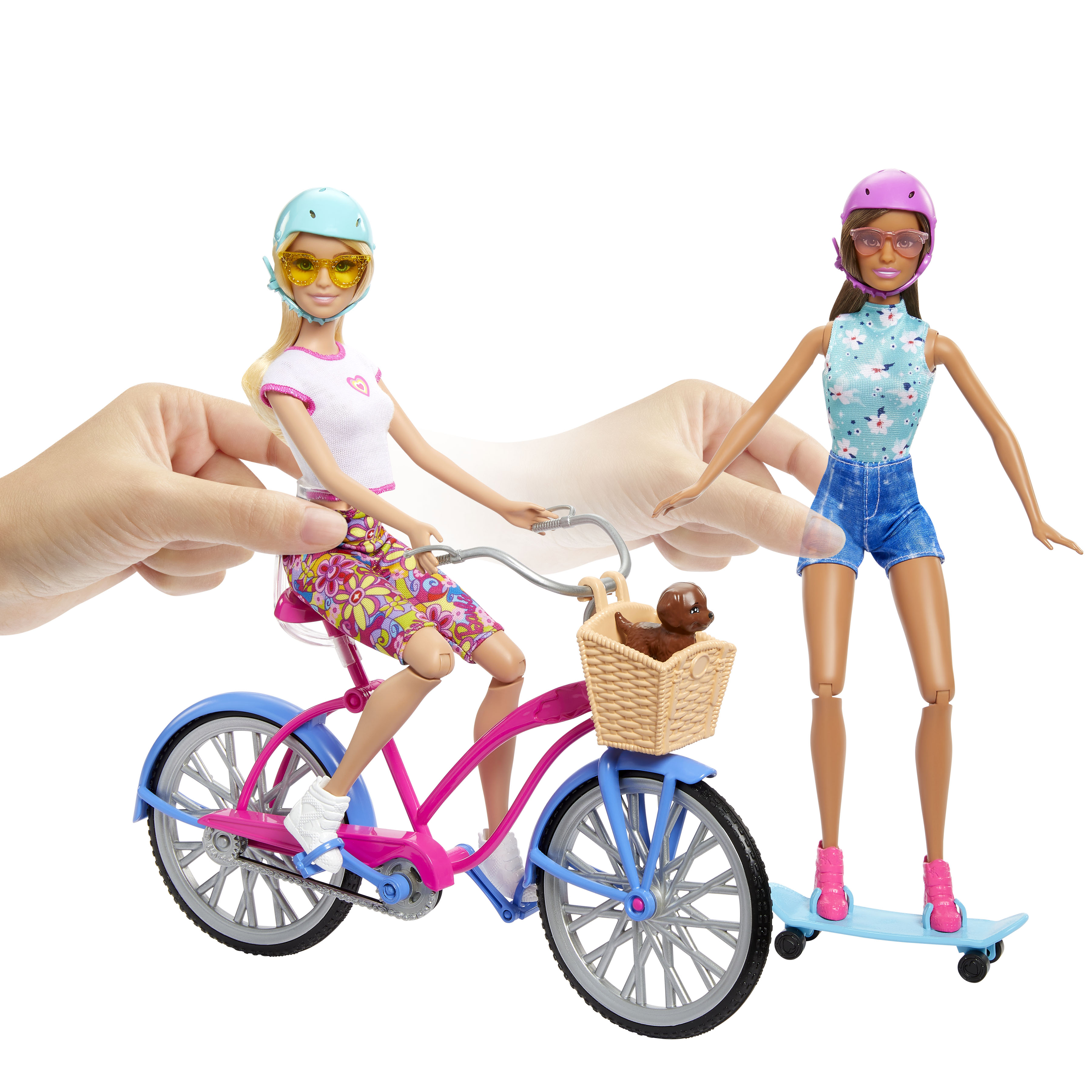 • จักรยานมีคลิปสำหรับตุ๊กตาบาร์บี้ ล้อเลื่อน และตะกร้า สเก็ตบอร์ดซึ่งก็เช่นกัน