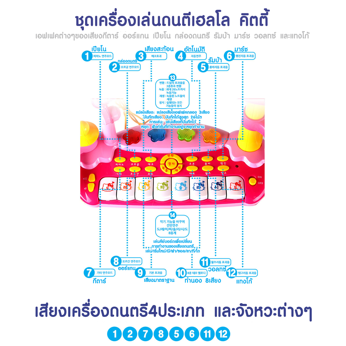 - ปุ่มเลือกเสียงเครื่องดนตรี 4ประเภท: กีตาร์ เปียโน กล่องดนตรี และออร์แกน