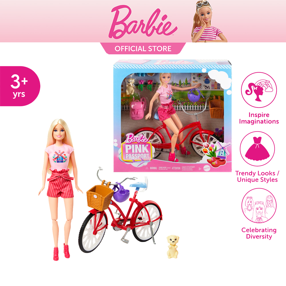 ????เพลย์เซตประกอบด้วยตุ๊กตาผมยาวสีบลอนด์สวมเสื้อผ้าสีสันสดใส จักรยานสีชมพูสวยพร้อมตะกร้าสีน้ำตาล