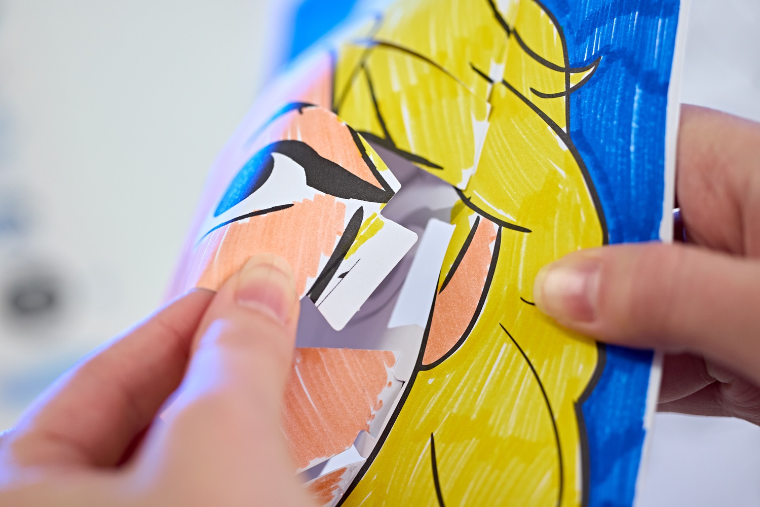 * ระบายสีภาพบนกระดาษป็อปอัพ และกระดาษพื้นหลังให้เสร็จ จากนั้นจัดกระดาษป็อปอัพให้เป็นรูปทรงตามรอยที่มีมาให้ แล้วเสียบกระดาษป็อปอัพลงในช่องกระดาษพื้นหลัง ก็จะได้ภาพ 3มิติ ใช้เทปกาวเพื่อยึดป็อปอัพให้แน่นไปกับพื้นหลัง