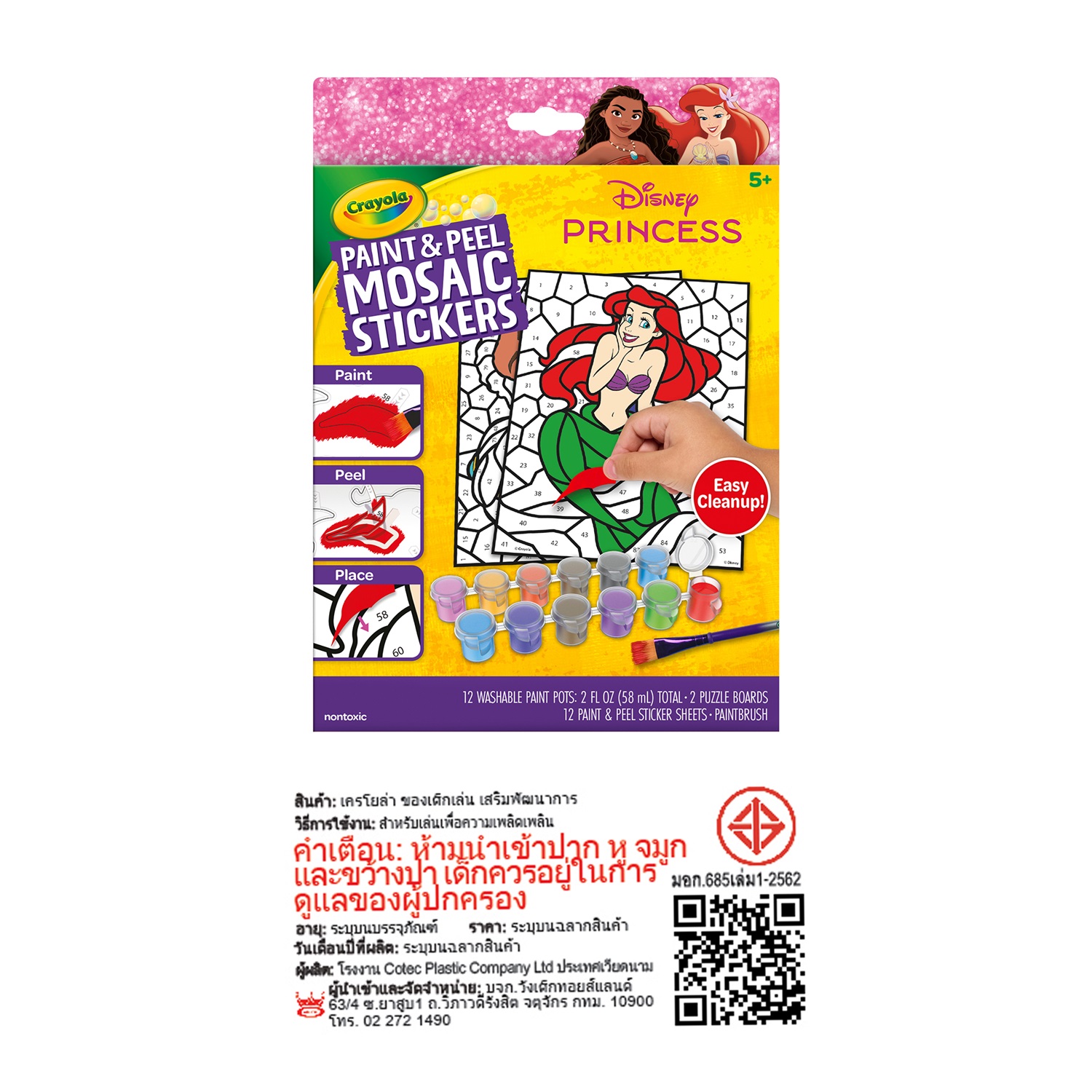 * ในชุดมาพร้อมกับ: กระดานโมเสก 2 แผ่น | กระถางสีล้างออกได้ 12 สี | แผ่นสติกเกอร์ลายเจ้าหญิงดิสนีย์ 12 แผ่น | พู่กันจับถนัดมือ | แผ่นคำแนะนำ
