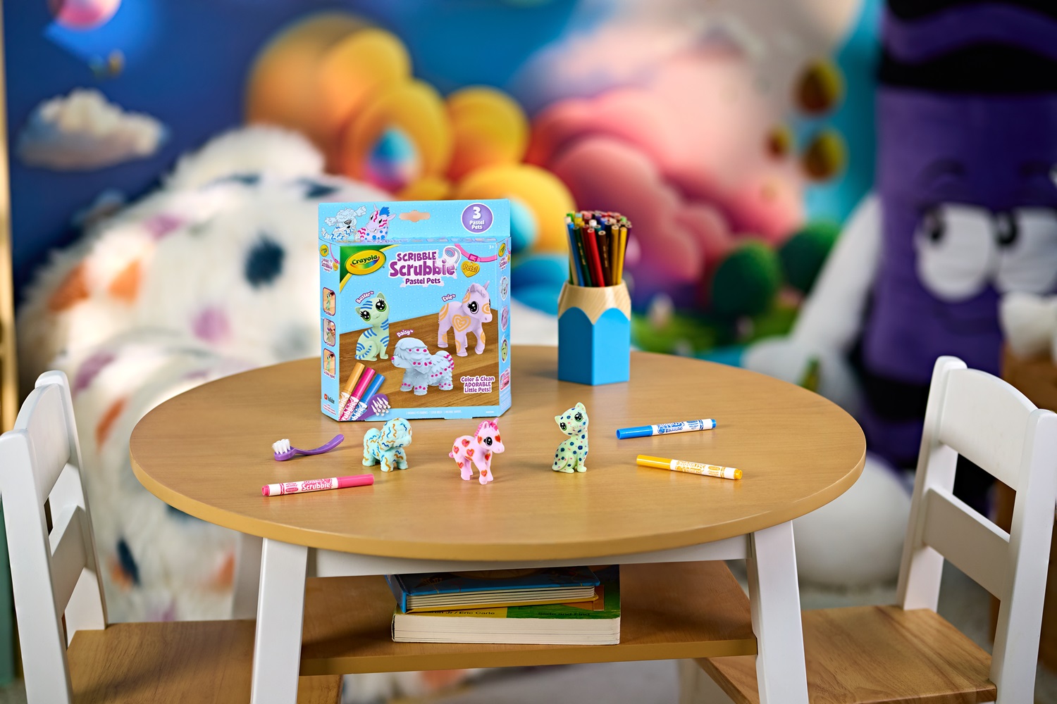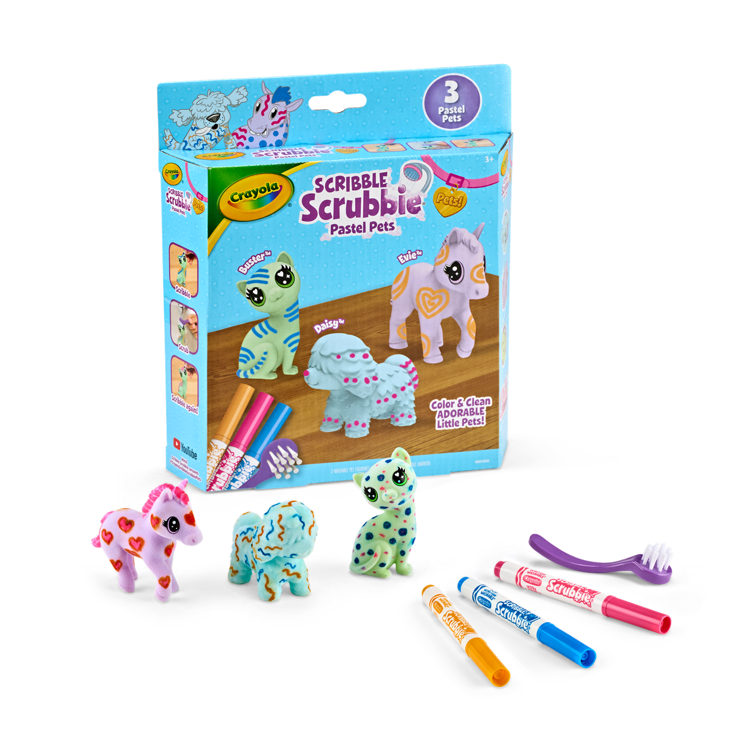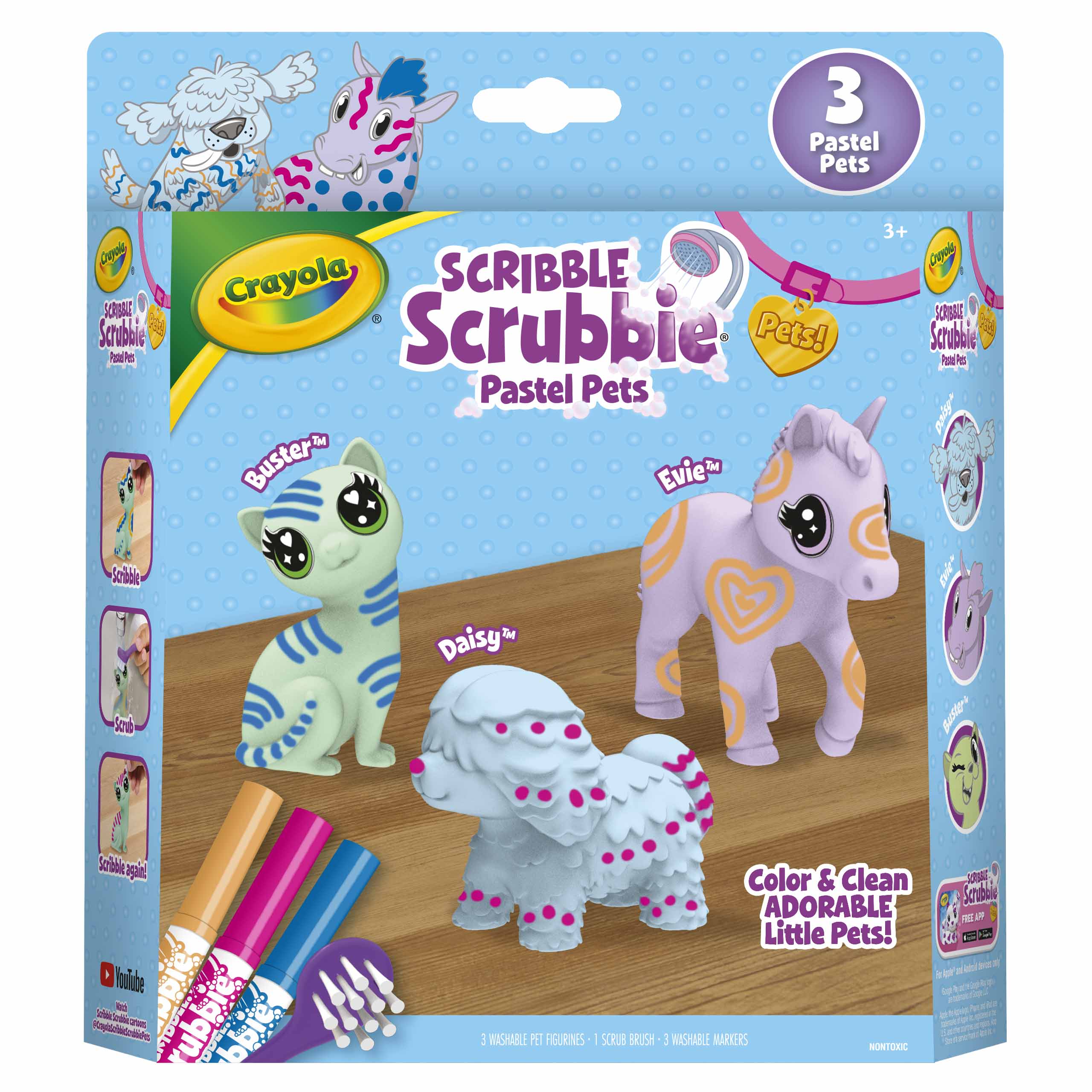 มาพร้อมสัตว์เลี้ยงขนนุ่มสีพาสเทล 3 ตัว ได้แก่ Daisy (สุนัข), Evie (ม้าโพนี่), และ Buster (แมว) เด็ก ๆ สามารถวาด ตกแต่ง และล้างออกเพื่อเล่นซ้ำได้อย่างไม่มีที่สิ้นสุด มาพร้อมปากกาล้างได้ 3 แท่ง และแปรงขัด ทำให้เด็กได้สนุกกับทั้งการสร้างสรรค์และการเล่นบทบาทสมมติ เหมาะสำหรับเด็กอายุ 3 ปีขึ้นไป
