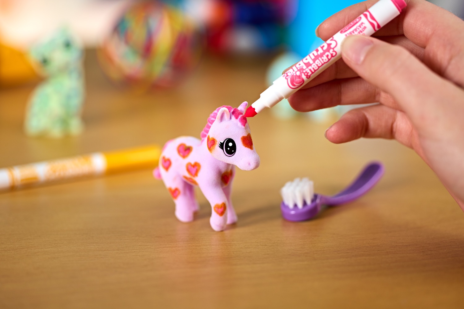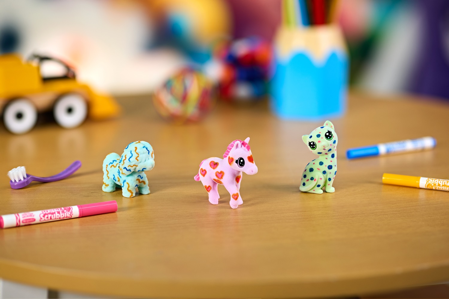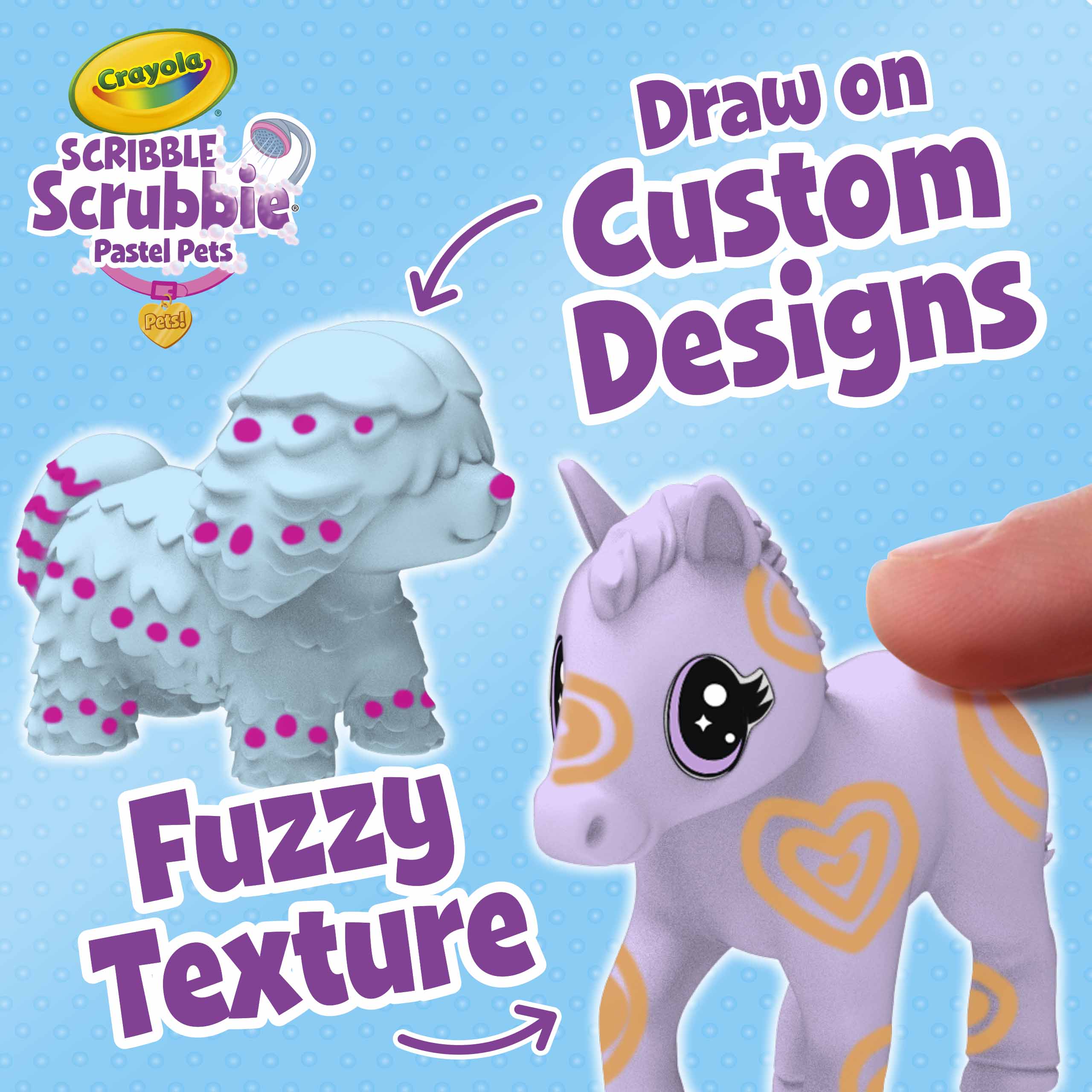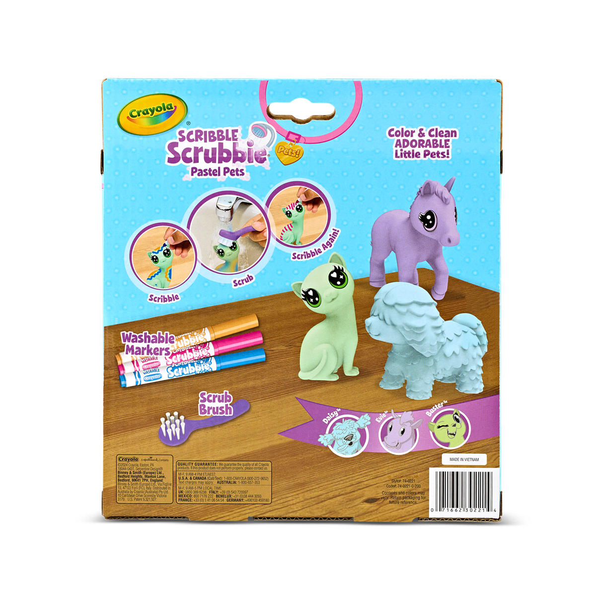 มาพร้อมสัตว์เลี้ยงขนนุ่มสีพาสเทล 3 ตัว ได้แก่ Daisy (สุนัข), Evie (ม้าโพนี่), และ Buster (แมว) เด็ก ๆ สามารถวาด ตกแต่ง และล้างออกเพื่อเล่นซ้ำได้อย่างไม่มีที่สิ้นสุด มาพร้อมปากกาล้างได้ 3 แท่ง และแปรงขัด ทำให้เด็กได้สนุกกับทั้งการสร้างสรรค์และการเล่นบทบาทสมมติ เหมาะสำหรับเด็กอายุ 3 ปีขึ้นไป