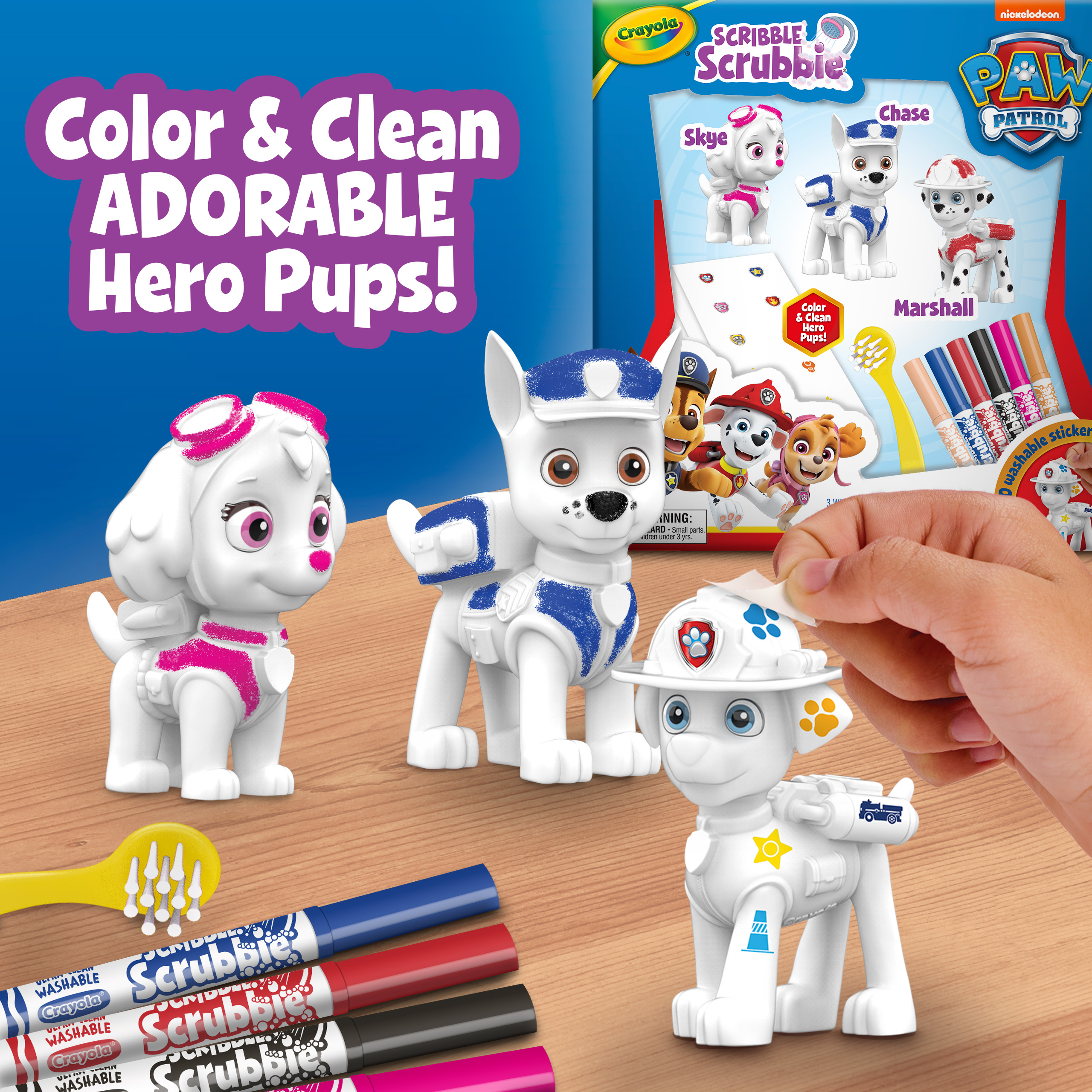 ร่วมภารกิจสนุกกับทีม PAW Patrol ! ชุดนี้มาพร้อมลูกสุนัข 3 ตัว ปากกาล้างได้ 6 แท่ง แปรงขัด และสติ๊กเกอร์ล้างได้ 40 ชิ้น เด็ก ๆ สามารถวาด ตกแต่ง ล้าง แล้วเริ่มสร้างสรรค์ใหม่ได้เรื่อย ๆ เหมาะสำหรับเด็กอายุ 3 ปีขึ้นไป ปลอดภัยและไม่มีสารพิษ