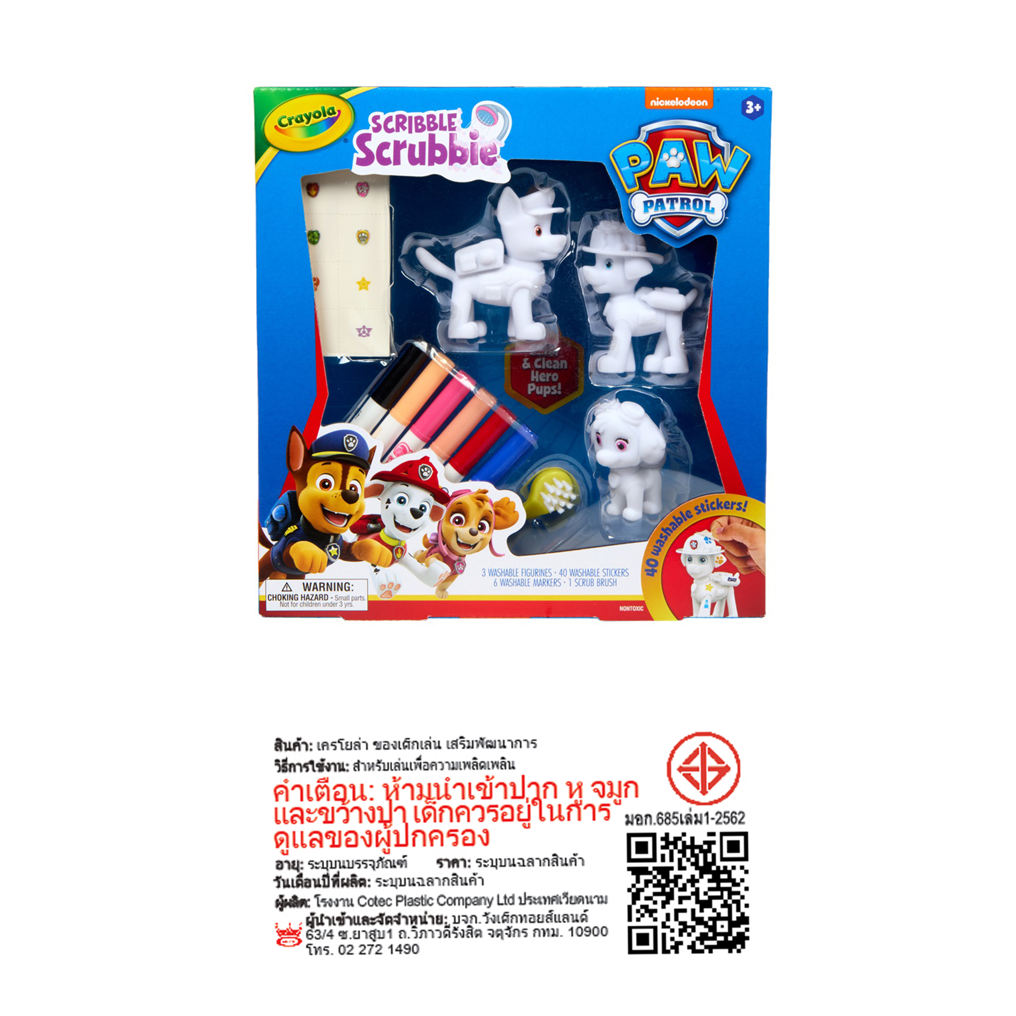 * ในชุดมาพร้อมกับ: ลูกสุนัข PAW Patrol 3 ตัว พร้อมปากกาล้างได้ 6 สี แปรงขัด และสติ๊กเกอร์ล้างได้ 40 ชิ้น