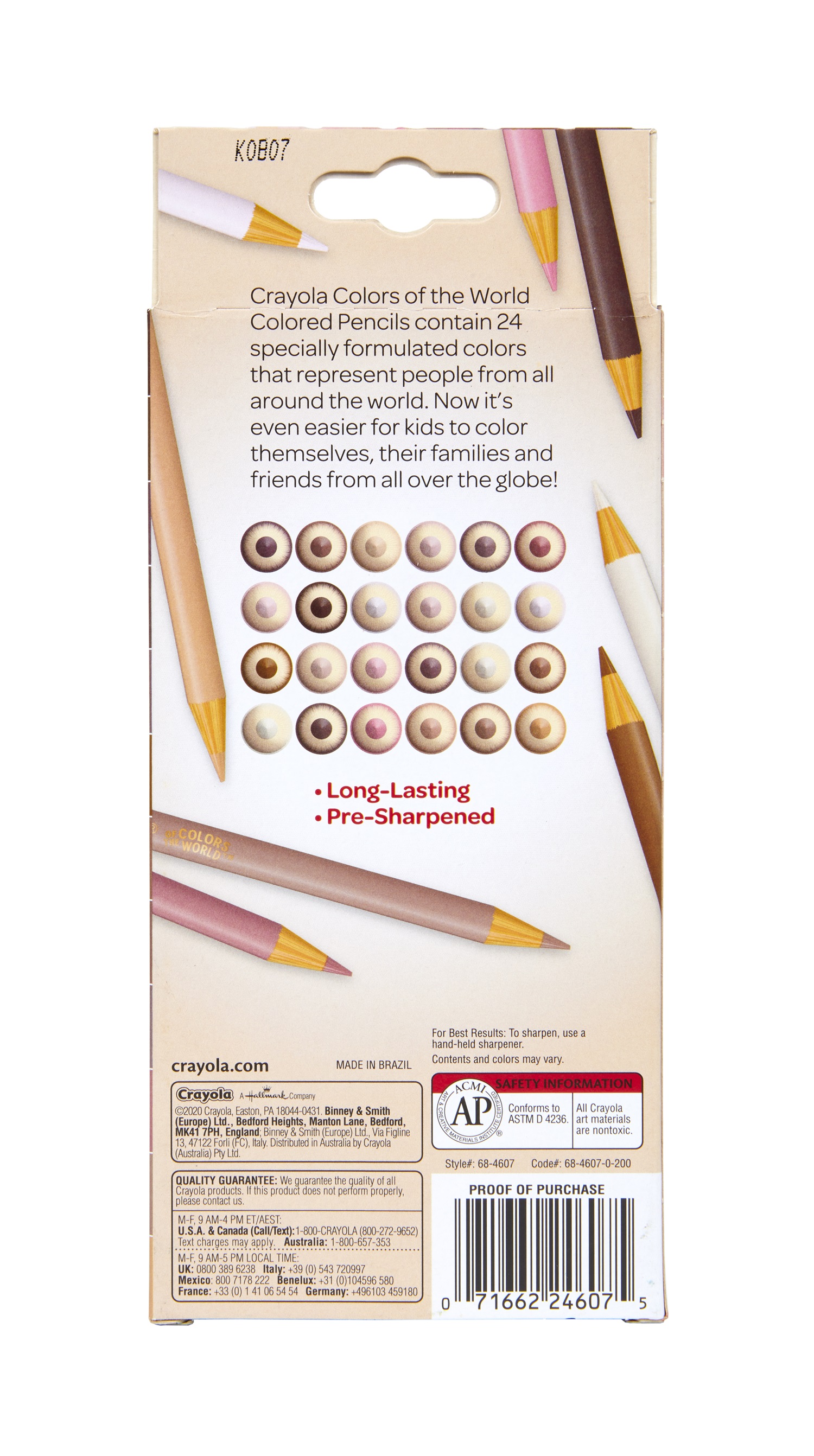 ✔ 24แท่ง 24เฉดสี แบ่งออกเป็นสามเฉดสีหลัก: อัลมอนด์ (Almond), โกลเด้น (Golden) และโรส (Rose) รวมถึงเฉดสีที่เข้มขึ้นหรืออ่อนลงระหว่างนั้น ชุดนี้ประกอบด้วยดินสอสีใหม่ 24 สีที่เป็นตัวแทนผู้คนจากทั่วโลก จับคู่กับสมุดระบายสี Crayola หรือเลือกซื้อสีเทียน Colors of the World ก็ได้!