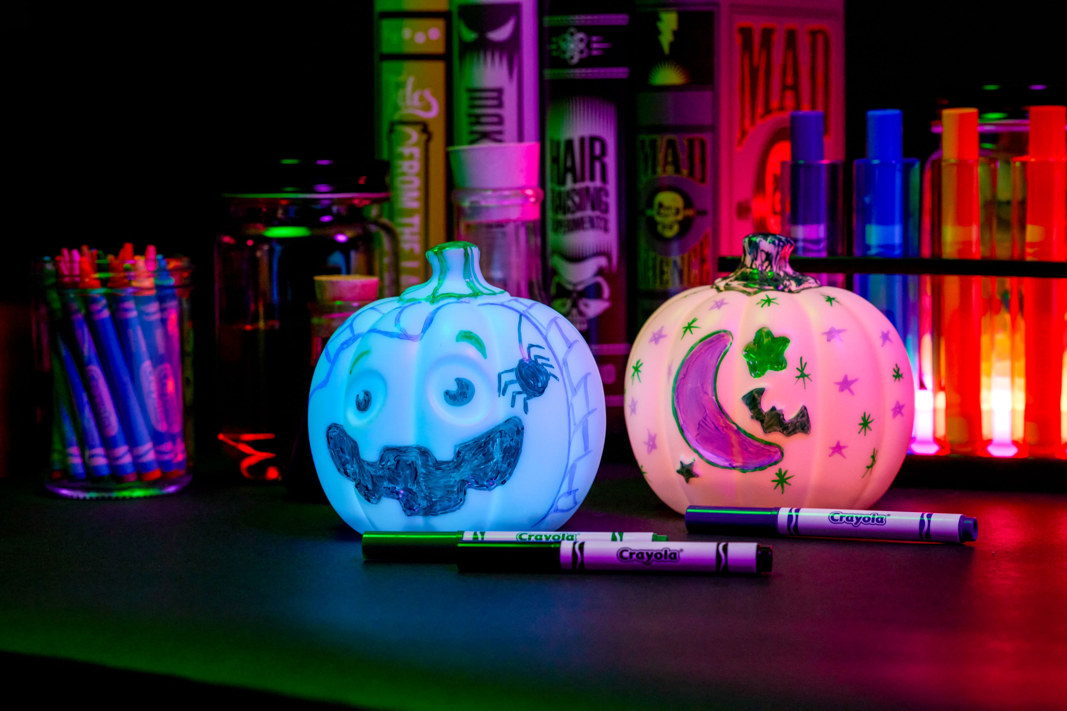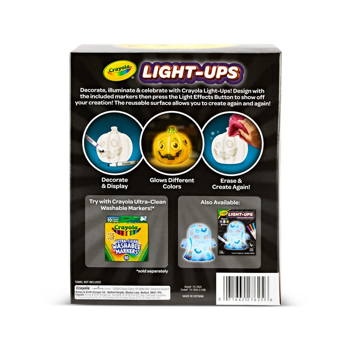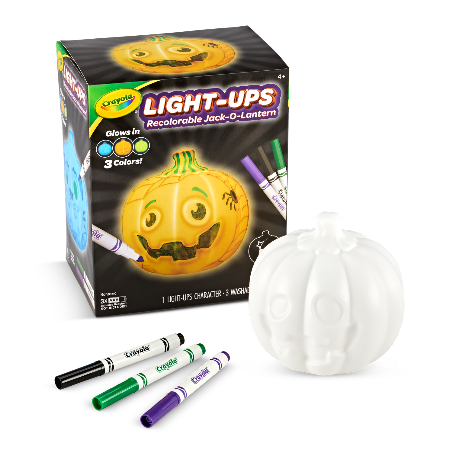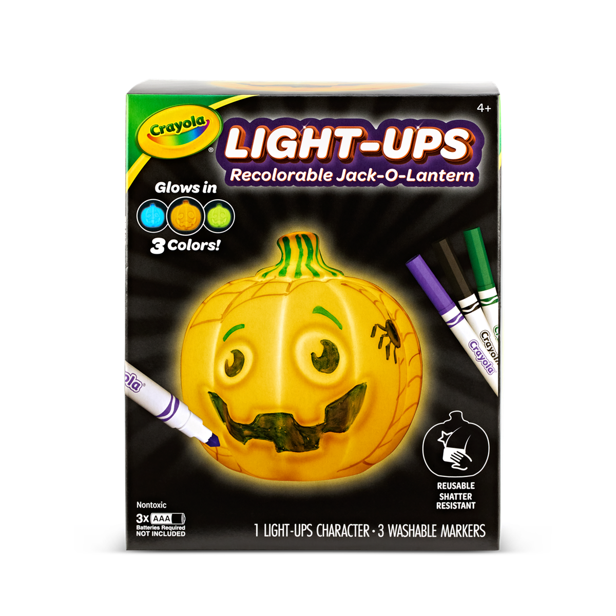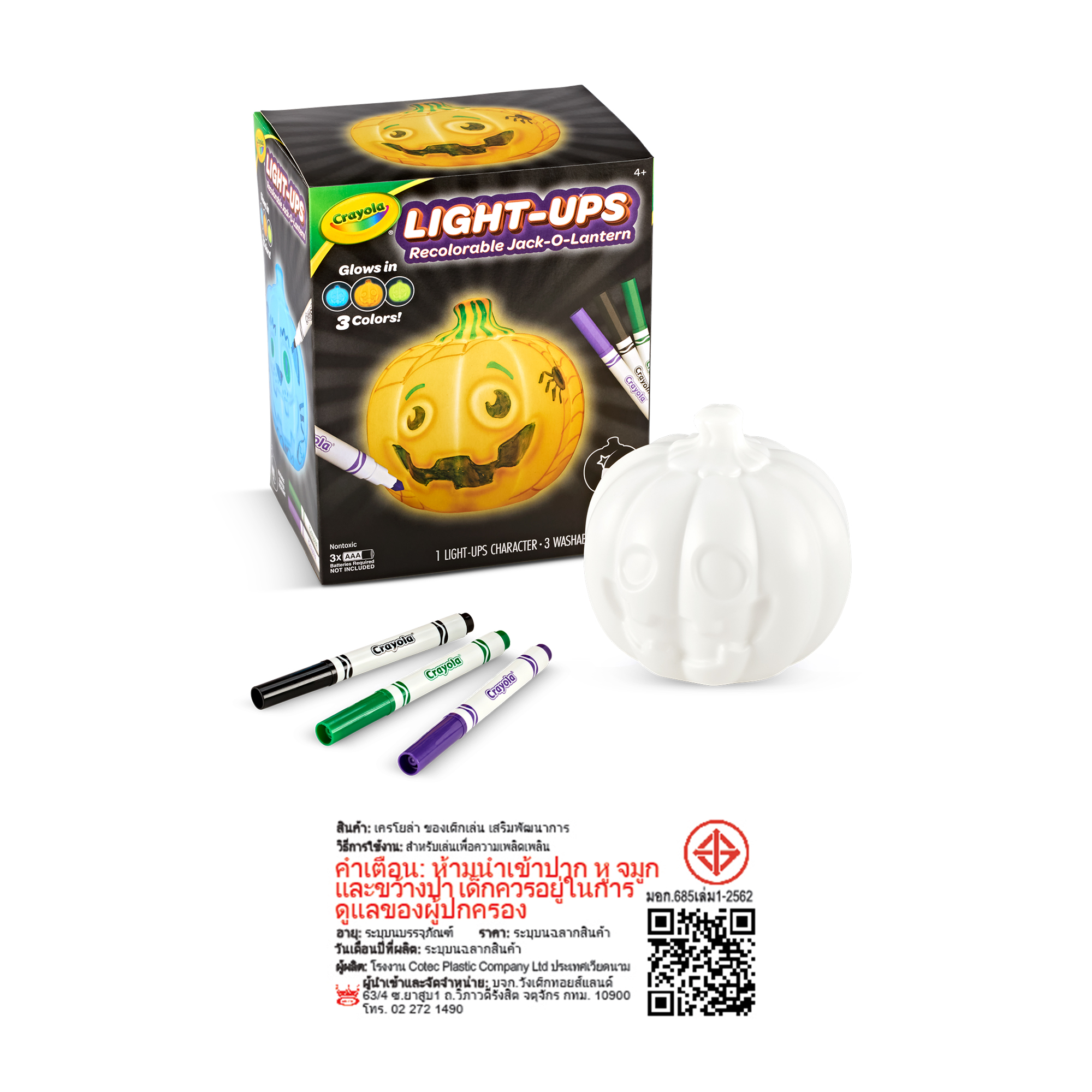 เตรียมตัวให้พร้อมสำหรับฮาโลวีนนี้ด้วย Crayola Light-Ups แจ็คโอแลนเทิร์น ฟักทองปีศาจ! ชวนเด็กๆ มาปลดปล่อยจินตนาการ ระบายสีตุ๊กตาฟักทองปีศาจในแบบของตัวเอง จากนั้นกดปุ่มให้ส่องแสง ตุ๊กตานี้เปลี่ยนสีแสงได้ถึง 3 สีสุดคูล ส้ม เขียว และฟ้า! ด้วยปากกาสีเมจิกล้างออกง่าย ไม่ต้องกลัวเลอะ จะระบายใหม่กี่ครั้งก็ได้ตามใจชอบ! เหมาะเป็นของขวัญฮาโลวีนสุดเพอร์เฟกต์สำหรับน้องๆ 4ปีขึ้นไป!