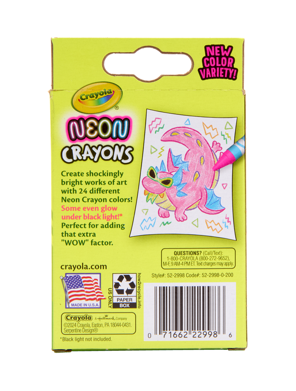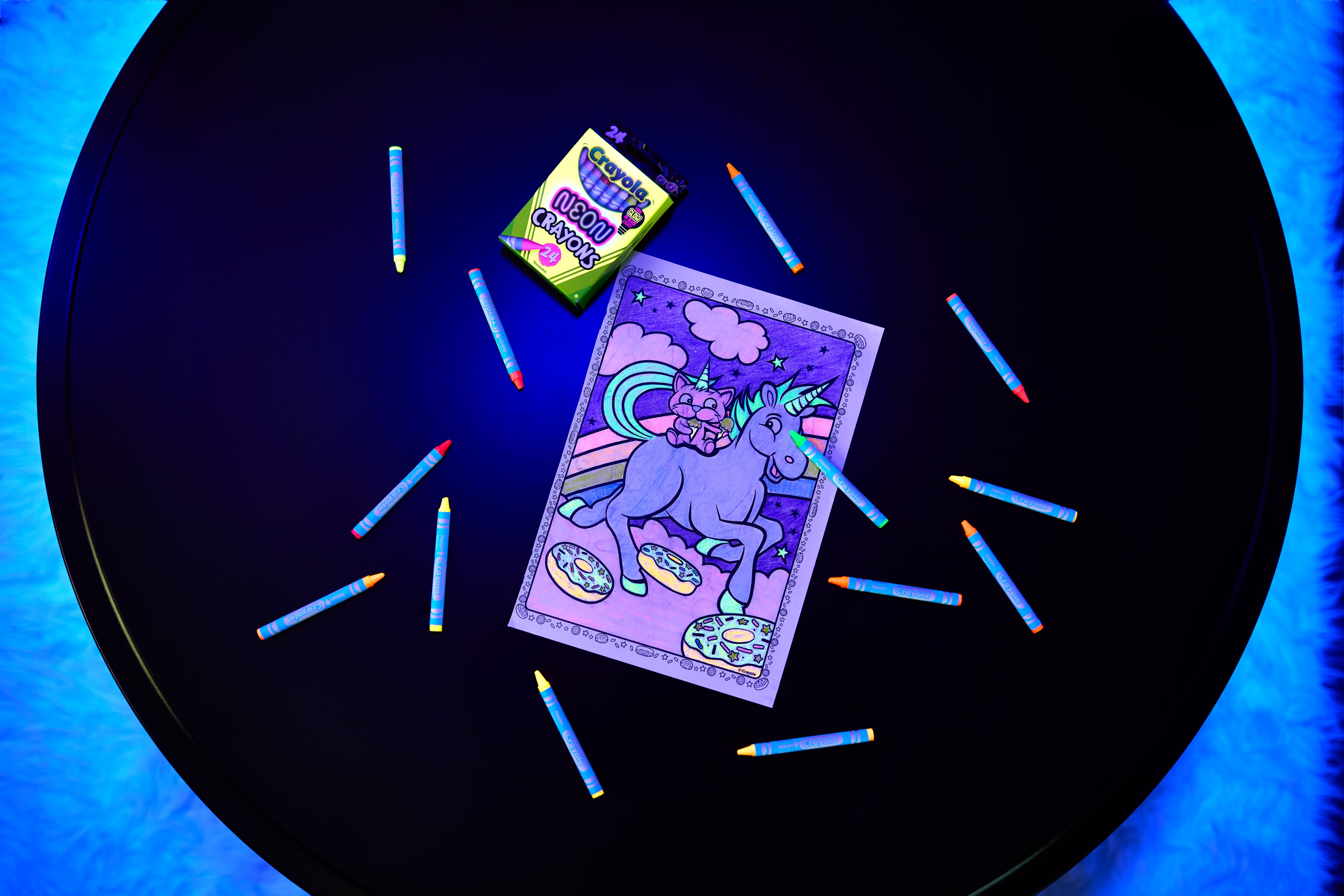 มาเปิดโลกแห่งสีสันสุดสในด้วย สีเทียน Crayola Neon Crayons! เปลี่ยนการวาดระบายให้กลายเป็นการผจญภัยที่ตื่นตาภายใต้แสงBlack Light* (ไม่ได้มาพร้อมผลิตภัณฑ์) ทำให้เกิดเอฟเฟกต์เรืองแสงที่น่าตื่นเต้นกับผลงาน
