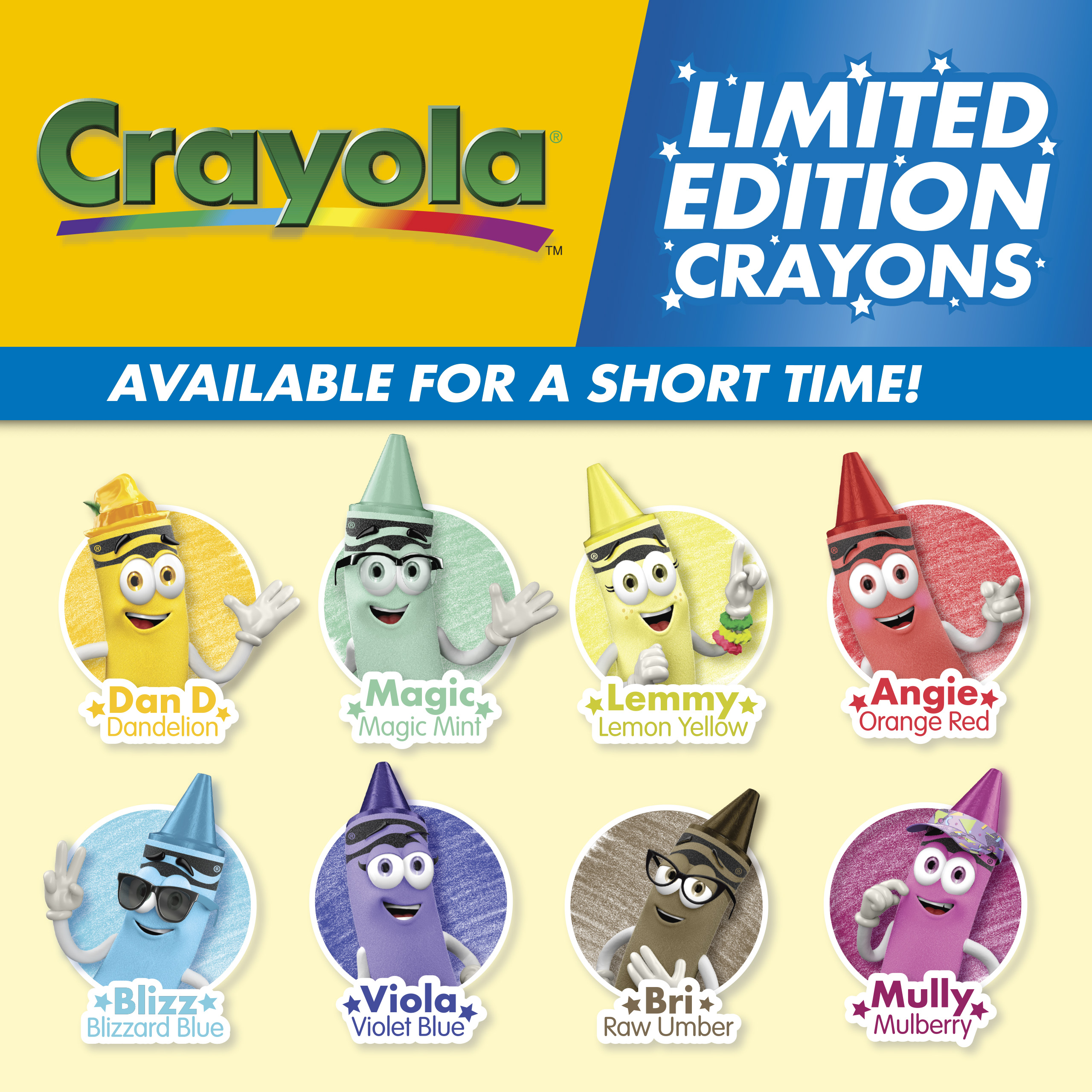 ✔ สีคลาสสิกลิมิเต็ดอิดิชัน 8เฉดสี กลับมาในรูปทรงสีเทียนตัวการ์ตูน Crayola สุดน่ารัก โอกาสพิเศษที่สีในตำนานจะกลับมาอีกครั้งแบบจำกัดจำนวน หมดแล้วไม่มีผลิตเพิ่ม