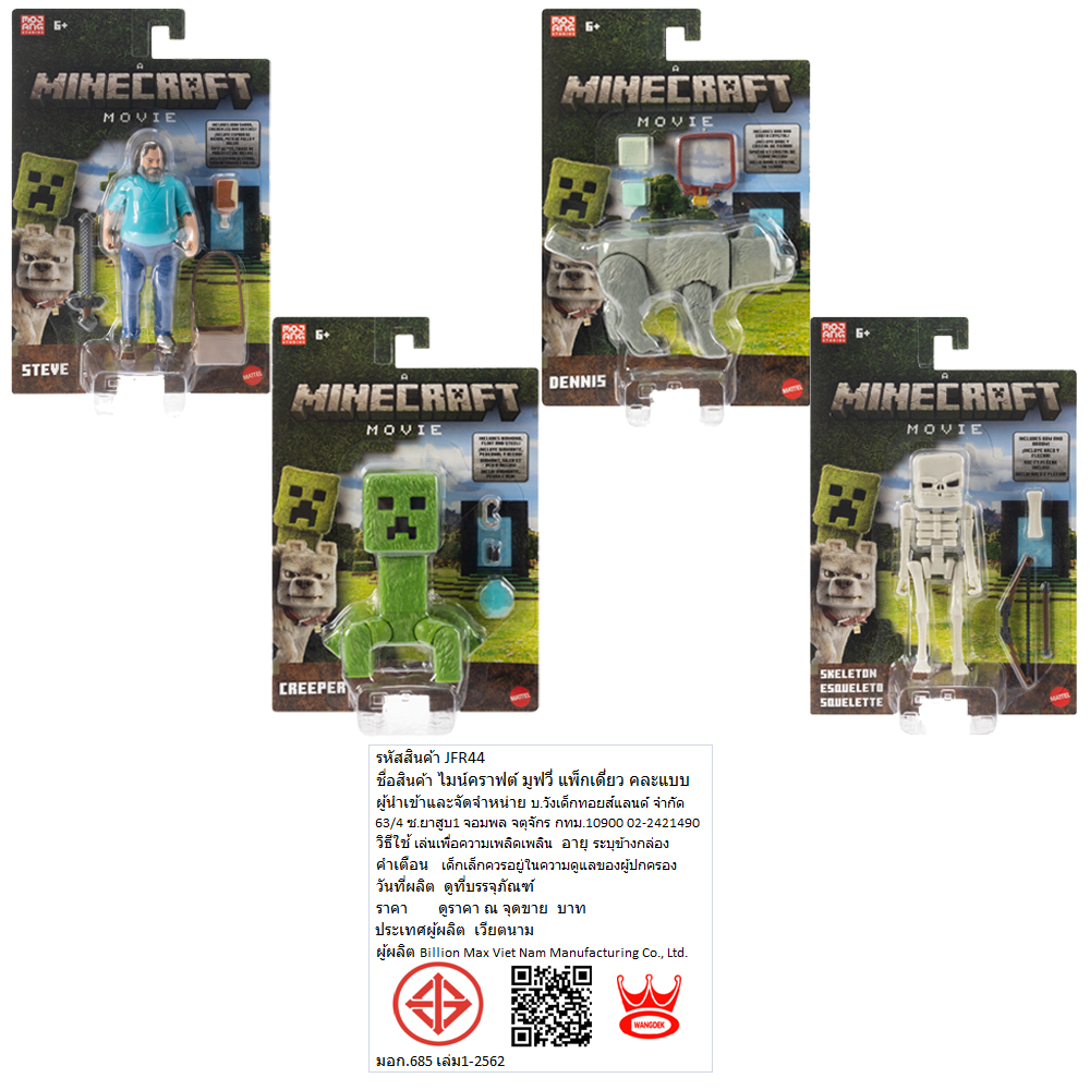 ในโลกของเกม - หากฝันที่จะมีสิ่งใด คุณก็สามารถสร้างมันขึ้นมาได้ ให้ฟิกเกอร์เหล่านี้จำลองฉากภาพยนตร์โปรดขึ้นมาใหม่หรือจะสร้างเรื่องขึ้นมาเองเลย! ฟิกเกอร์สะสมเหล่านี้เป็นของขวัญที่ให้ได้ทั้งแฟนเกมและแฟนภาพยนตร์ไมน์คราฟท์มูวี่ ที่มีอายุตั้งแต่ 6 ปีขึ้นไป! แต่ละชิ้นจำหน่ายแยกกัน ขึ้นอยู่กับความพร้อมให้บริการ สีและการตกแต่งอาจแตกต่างจากภาพประกอบ