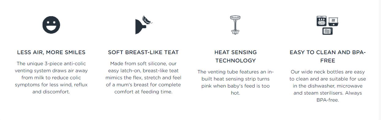 * ท่ออากาศภายในขวด และวาล์ว จะช่วยลดการเกิดอาการโคลิคที่เกิดจากการดูดนมจากขวดนมได้มากถึง 80%