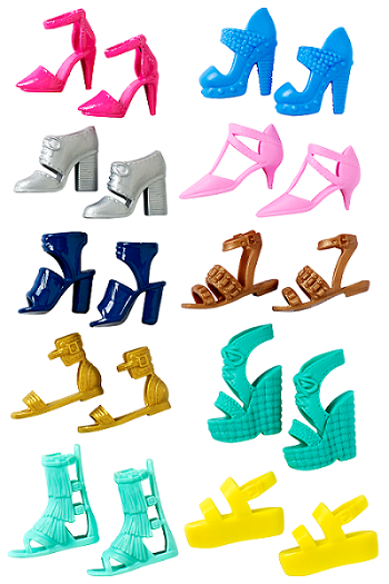 Barbie® doll has the best shoe collection! She’s always got the perfect pair of shoes to complete a great look and go on any adventure. With five pairs of fabulous shoes fitted to Tall and Curvy Barbie® dolls in this accessory pack (doll sold separately), you can find the right pair to fit your style and your story -- then change them to switch it up in an instant. The shoes include a mix of heels and flats, colors and trends. Young imaginations will love finding the perfect pieces to fit their style and tell their stories -- because with Barbie®, you can be anything! Collect them all to mix and match and expand the storytelling fun (each sold separately, subject to availability). Includes five pairs of shoes fitted to Barbie® dolls of tall and curvy body type; doll not included. Flat shoes fit dolls with articulated ankles or flat feet. Colors and decorations may vary.